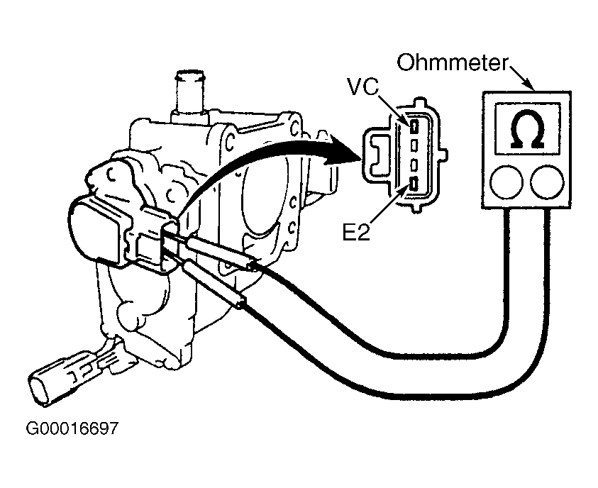 15. Disconnect electrical connector at TP sensor. See Fig 1. Using ohmmeter, check resistance between terminals E2 and VC on TP sensor. See Fig 4. Replace TP sensor if resistance is not 1200-3200 ohms at 68°F (20°C). See THROTTLE BODY under FUEL SYSTEMS in REMOVAL, OVERHAUL & INSTALLATION - 4-CYLINDER article.