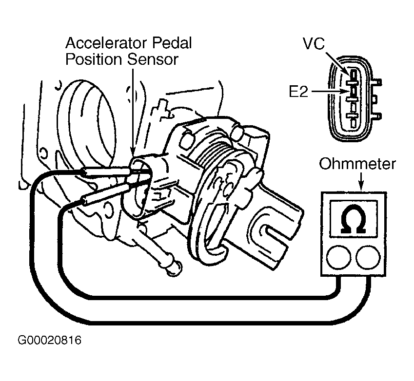 17. Disconnect electrical connector at accelerator pedal position sensor. See Fig 1. Using ohmmeter, check resistance between terminals E2 and VC on accelerator pedal position sensor. See Fig 5. Replace accelerator pedal position sensor if resistance is not 1200-3200 ohms at 68°F (20°C). See THROTTLE BODY under FUEL SYSTEMS in REMOVAL, OVERHAUL & INSTALLATION - 4-CYLINDER article.