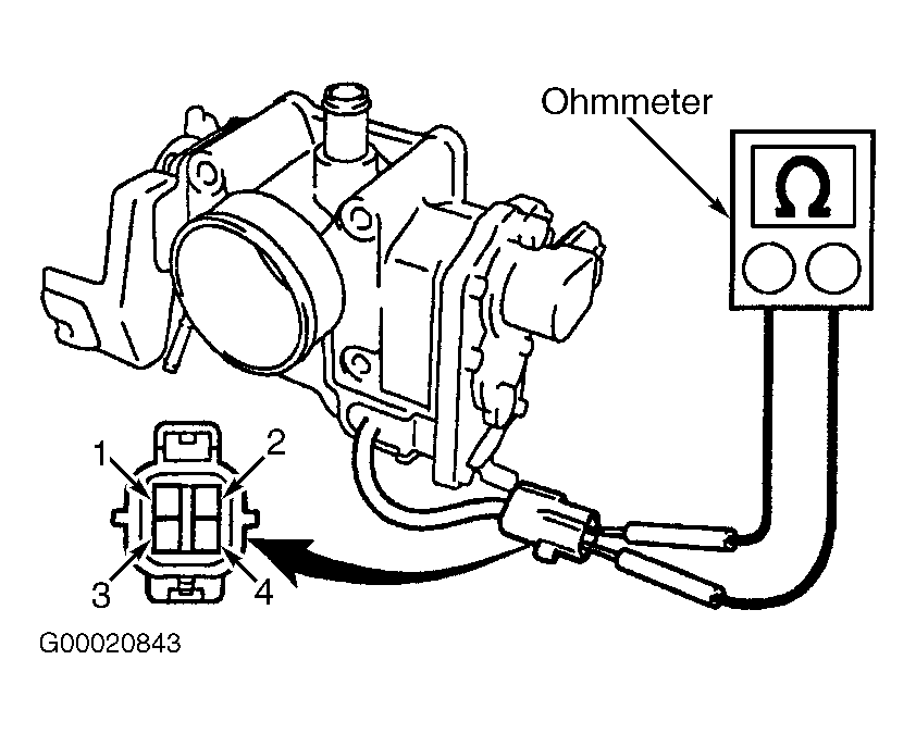 13. Note terminal identification on throttle control motor. See Fig 3. Using ohmmeter, check resistance between specified terminals on throttle control motor. See THROTTLE CONTROL MOTOR RESISTANCE  table. If resistance is within specification, reinstall electrical connector. Go to next step. If resistance is not within specification, replace throttle body with throttle control motor as an assembly.