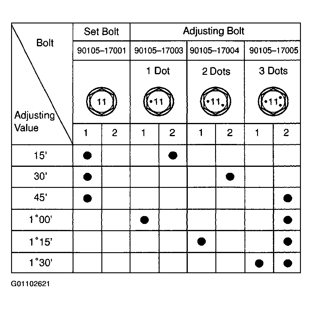 - Adjusting value for the set bolts is 6'-30' (0.1° - 0.5°).