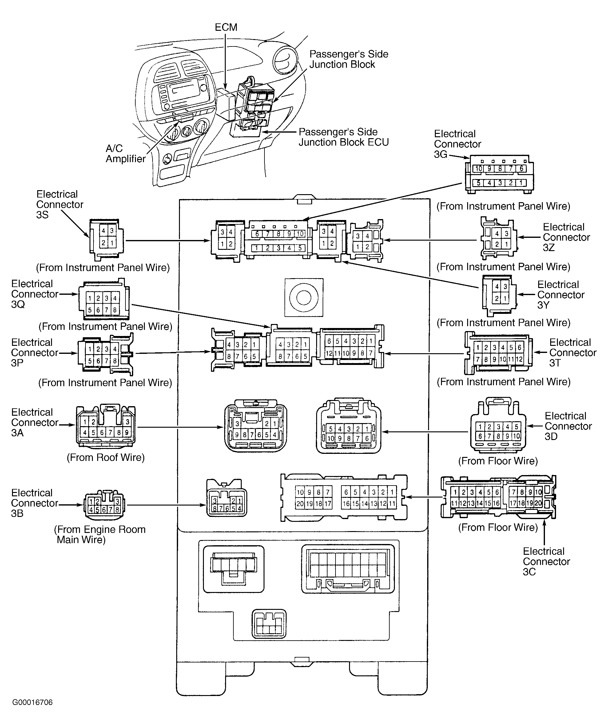 - Turn ignition on. Using voltmeter, check voltage between body ground and terminal No. 15 (Red/Yellow or White wire) at ECM electrical connector E7. This is the ACMG terminal on ECM. There are 2 different wiring harnesses used. Wire color at designated terminal may vary according to wiring harness used. Voltage should be 9-14 volts. If voltage is within specification, go to next step. If voltage is not within specification, check Red/Yellow or White wire and electrical connector between ECM and terminal No. 3 (Red/Yellow or White wire) at electrical connector 3S on passenger's side junction block Electronic Control Unit (ECU). See Fig 1.
