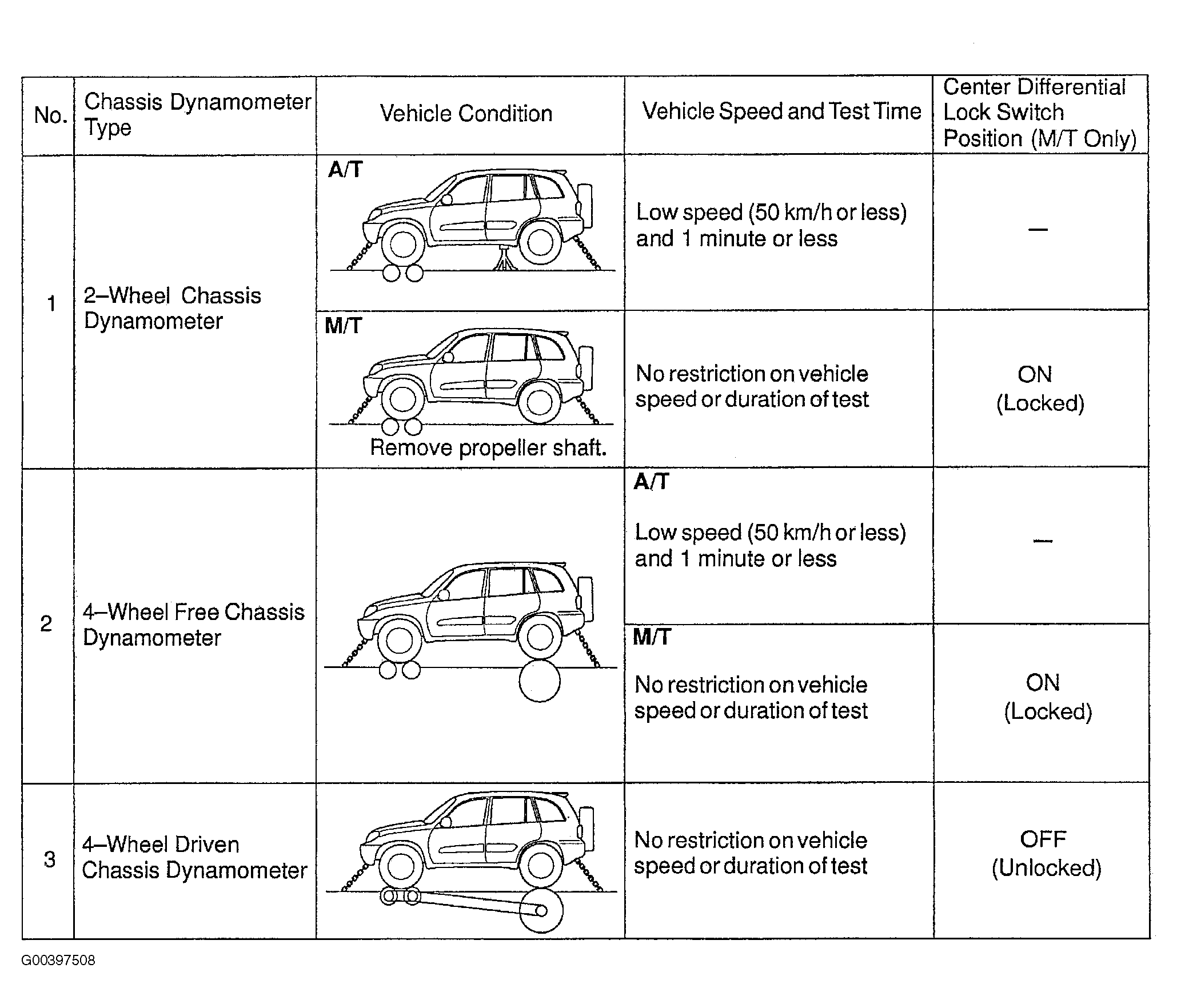 1. Before beginning test, during tests with a brake tester or chassis dynamometer, such as braking force tests or speedometer tests, if only the front or rear wheels are to be rotated, it is necessary to set the position of the center differential to the FREE position or to the LOCK position depending on the type of test being performed.