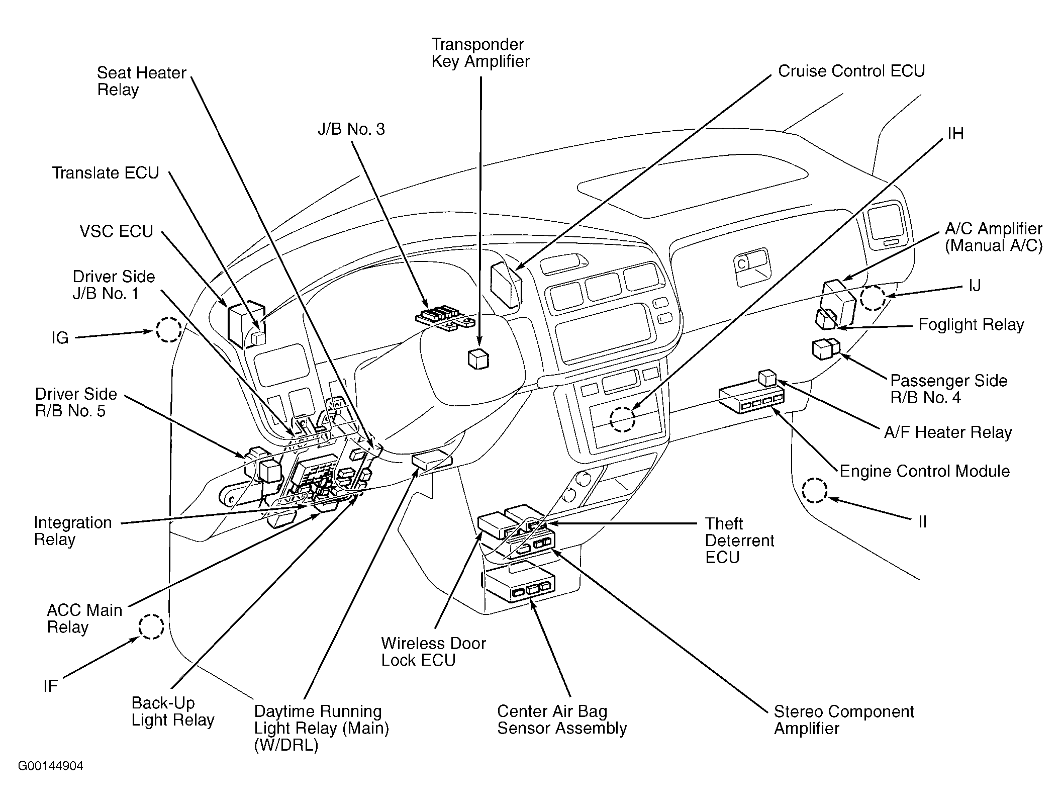 | VSC ECU | Behind upper left end of dash. See Figure. |