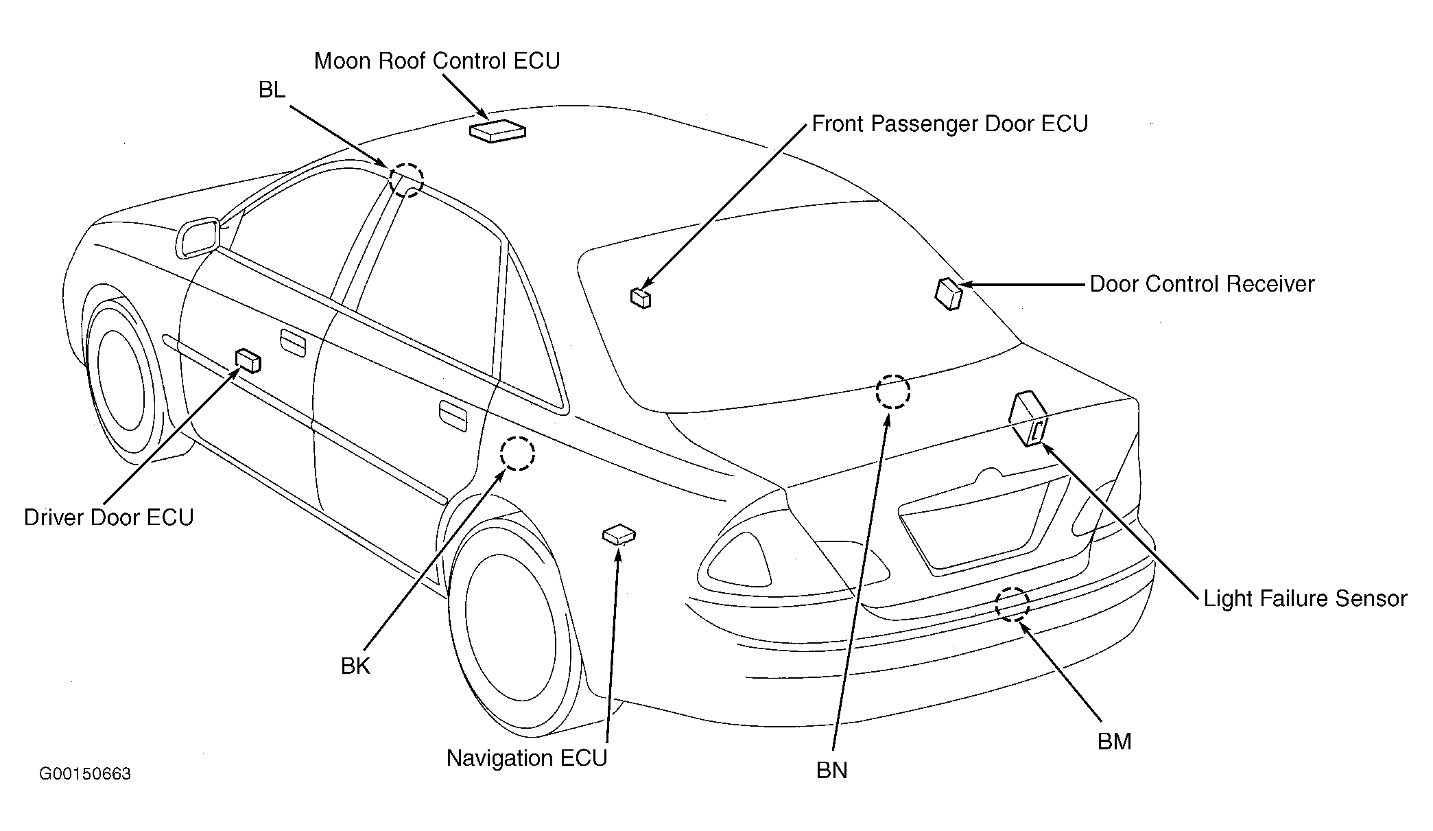 | Moon Roof Control ECU | In front center of roof. See Figure. |