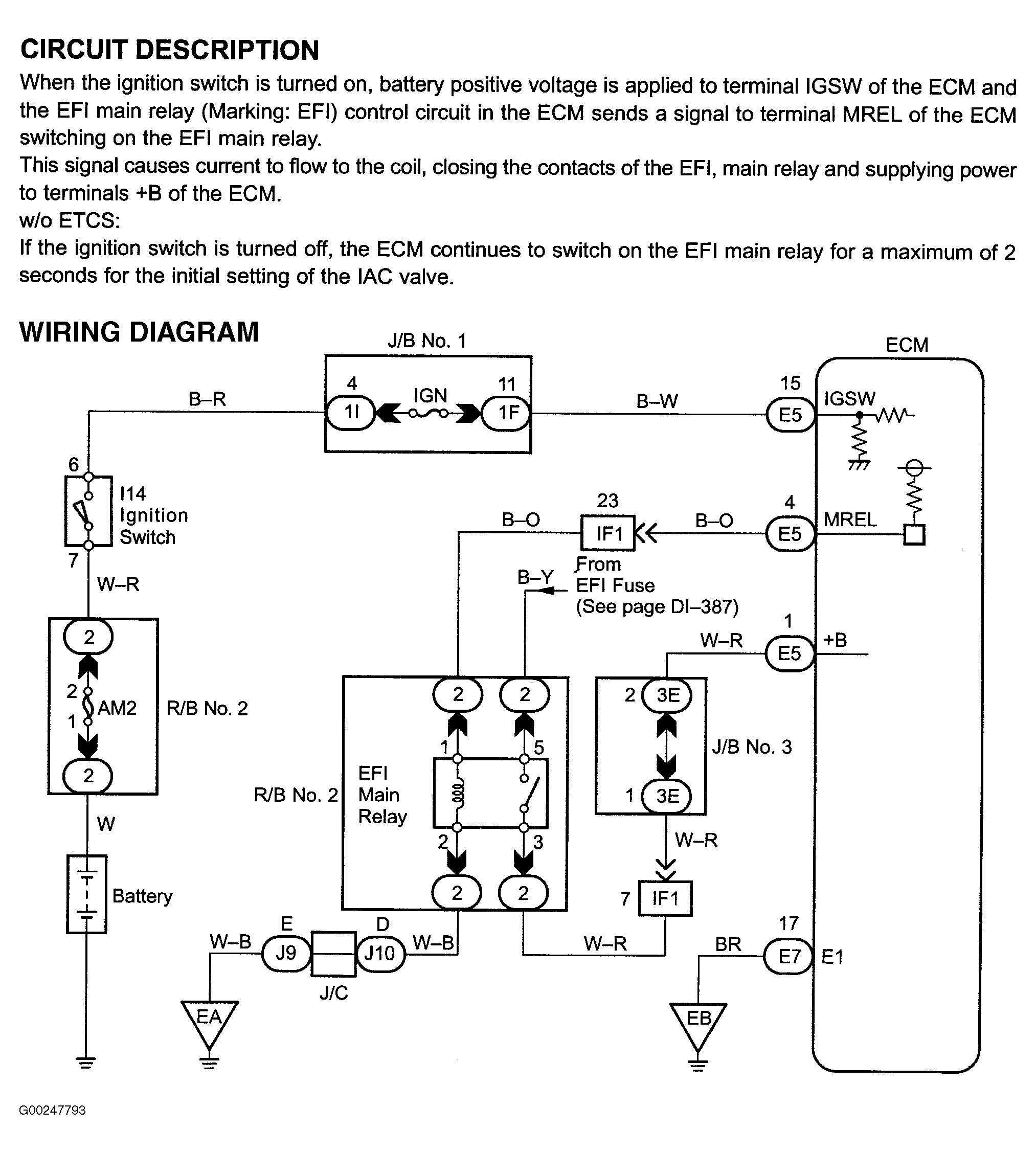For engine control module power source circuit inspection, see Fig 1-Fig 6 . For circuit identification, see ENGINE PERFORMANCE in appropriate SYSTEM WIRING DIAGRAMS article in ELECTRICAL. Before replacing ECM, check ECM connectors and ground circuits. See ENGINE CONTROL MODULE POWER & GROUND CIRCUITS  under COMPUTERIZED ENGINE CONTROLS. To check ignition switch, see appropriate STEERING COLUMN SWITCHES article in ACCESSORIES & EQUIPMENT. To check EFI main relay, see EFI MAIN RELAY  under MODULES, MOTORS, RELAYS & SOLENOIDS.
