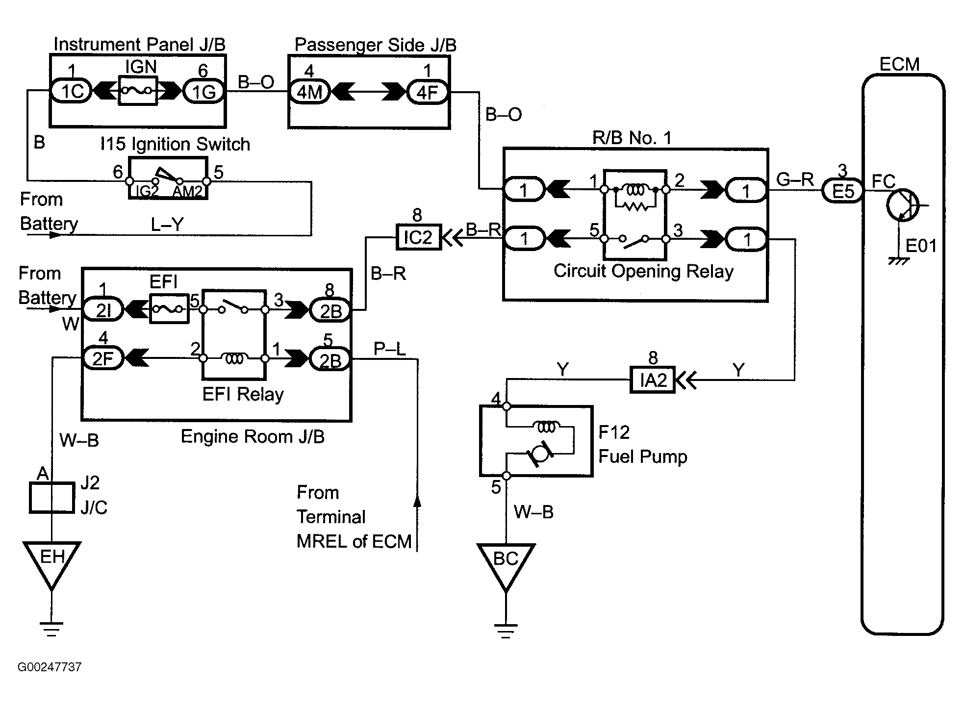For fuel pump control circuit inspection and wiring diagram, see Fig 1-Fig 6 . To check starter signal circuit, see STARTER SIGNAL CIRCUIT . To check ECM power source circuit, see ENGINE CONTROL MODULE POWER SOURCE CIRCUIT . To check circuit opening relay, see CIRCUIT OPENING RELAY under MODULES, MOTORS, RELAYS & SOLENOIDS. For circuit identification, see ENGINE PERFORMANCE in appropriate SYSTEM WIRING DIAGRAMS article in ELECTRICAL. To check fuel pump operation, see FUEL DELIVERY under FUEL SYSTEMS. Before replacing ECM, check ECM connectors and ground circuits. See ENGINE CONTROL MODULE POWER & GROUND CIRCUITS under COMPUTERIZED ENGINE CONTROLS.