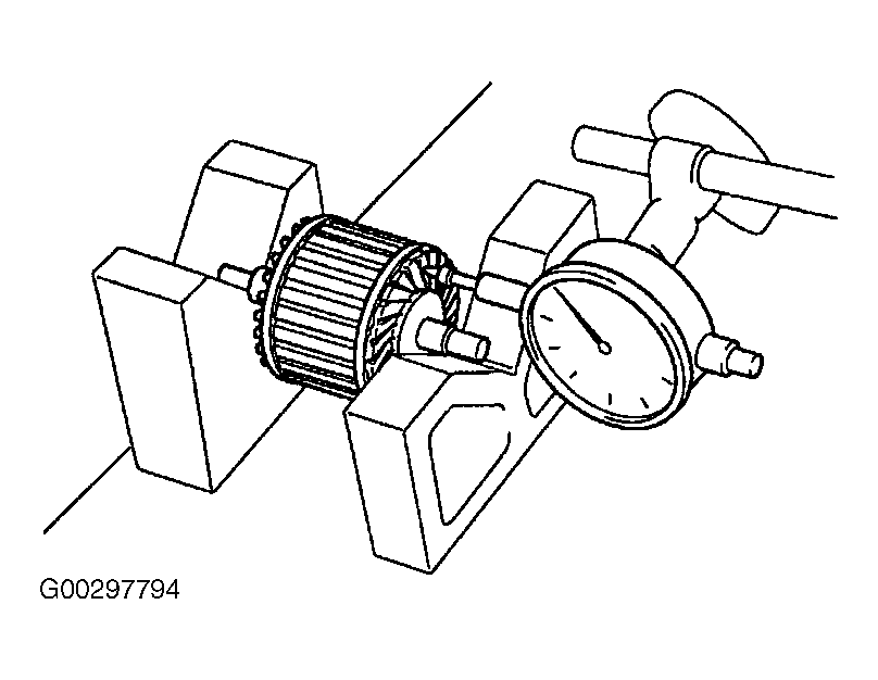- Using a dial indicator, measure the circle runout to ensure it is within specification. See STARTER SPECIFICATIONS . If the circle runout is greater than maximum, replace the armature.
