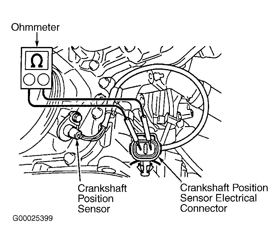 2. Disconnect crankshaft position sensor electrical connector. Using ohmmeter, check resistance between electrical terminals on crankshaft position sensor electrical connector. Ensure crankshaft position sensor resistance is within specification. See CRANKSHAFT POSITION SENSOR RESISTANCE  table. Replace crankshaft position sensor if resistance is not within specification. See CRANKSHAFT POSITION SENSOR under IGNITION SYSTEMS in REMOVAL & INSTALLATION - 4-CYLINDER article. Reinstall crankshaft position sensor electrical connector and A/C compressor. Tighten A/C compressor retaining bolts to 18 ft. lbs. (24 N.m). Install lower front engine cover.