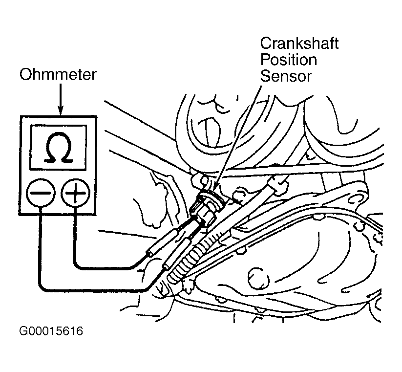 - Using ohmmeter, check resistance between electrical terminals on crankshaft position sensor. Ensure crankshaft position sensor resistance is within specification. See CRANKSHAFT POSITION SENSOR RESISTANCE table. Replace crankshaft position sensor if resistance is not within specification. See CRANKSHAFT POSITION SENSOR under IGNITION SYSTEMS in REMOVAL & INSTALLATION - 4-CYLINDER article. Reinstall crankshaft position sensor electrical connector and passenger's side engine cover.