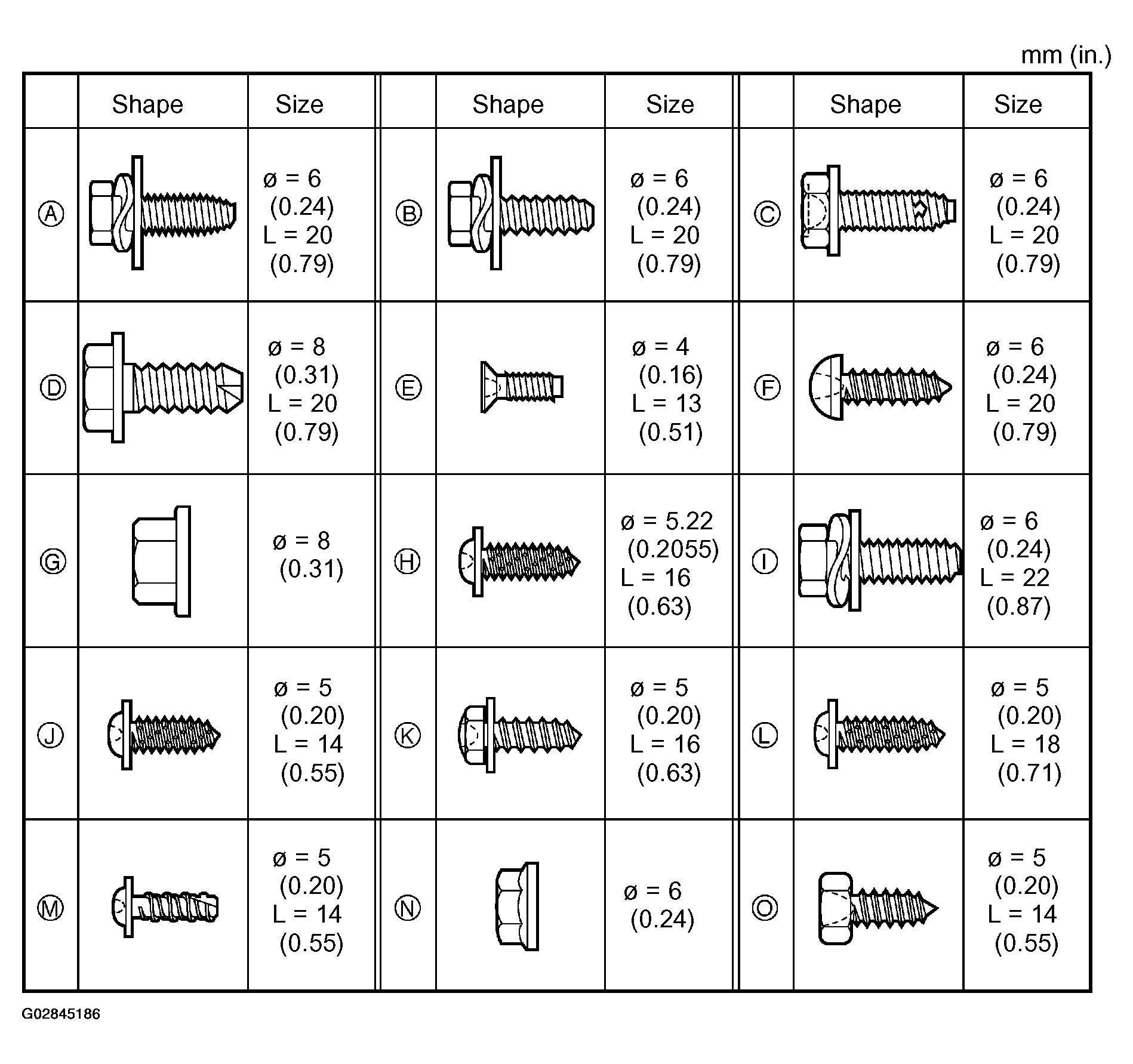 Screw shapes and sizes are indicated in Fig 1. The codes ("A" - "O") correspond to those indicated in Fig 2 and Fig 3.