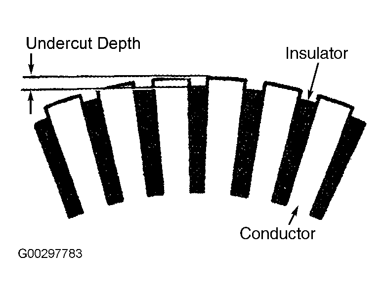 - Ensure undercut depth between commutator segments are clean, free of debris, and that edges are smooth, and within specification, see Fig 3. If undercut depth is less than minimum, use a hacksaw blade to correct it. See STARTER SPECIFICATIONS .