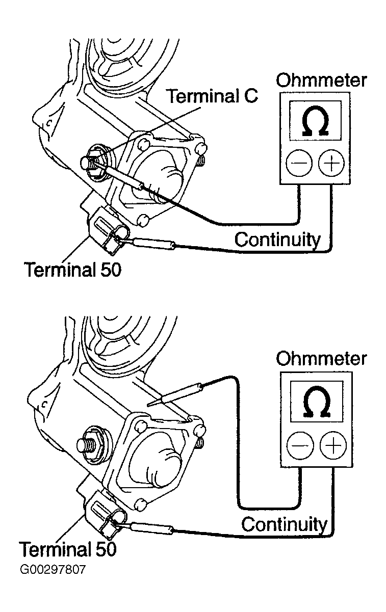 1. Using an ohmmeter, check that there is continuity between terminals 50 and "C". See Fig 1. If there is no continuity, replace the repair service starter kit.