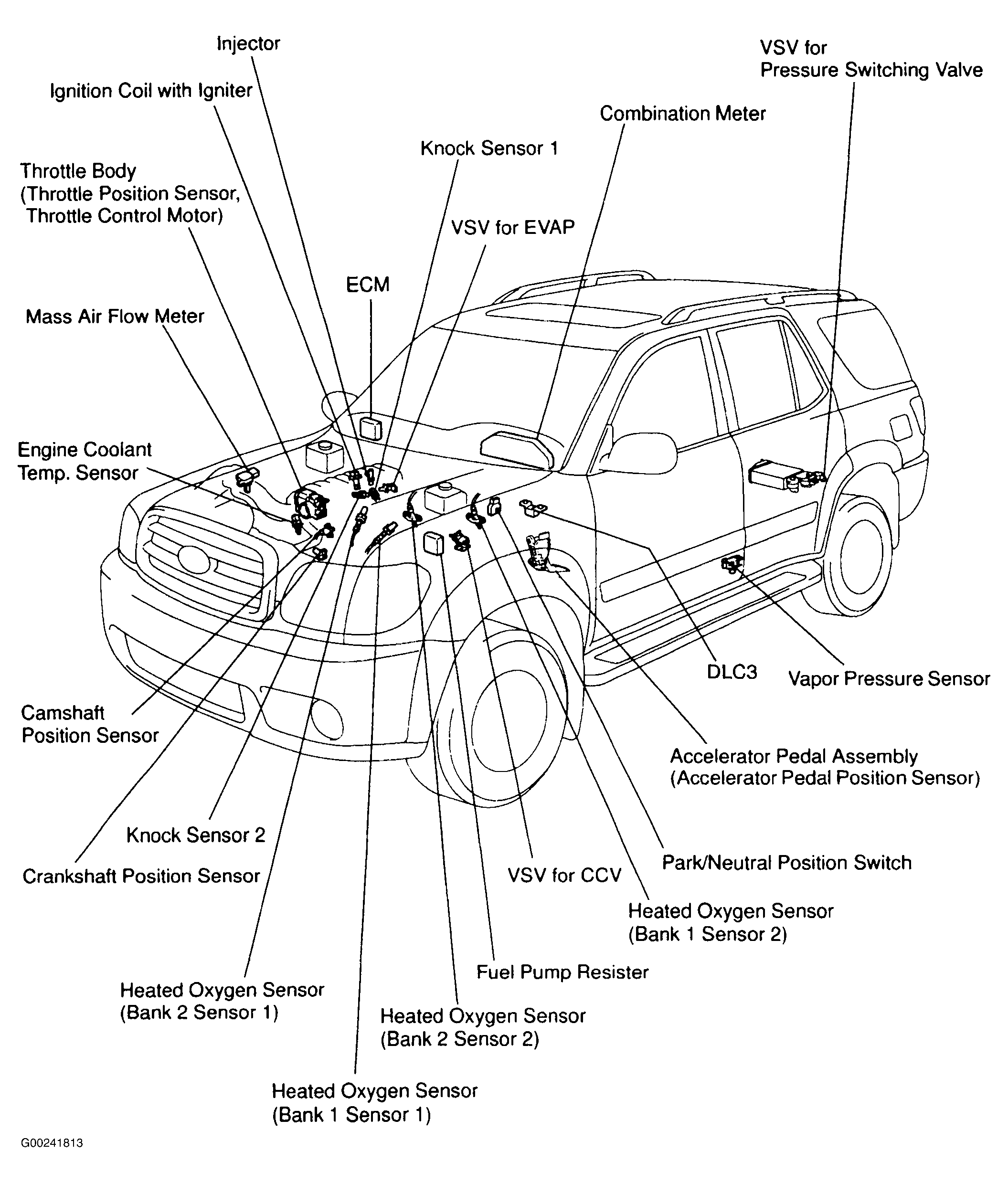 When performing diagnostic tests, it may be necessary to identify Engine Control Module (ECM) electrical connector terminals which are referenced to in testing procedure. See Fig 1. For locating emission related components, see Fig 2.