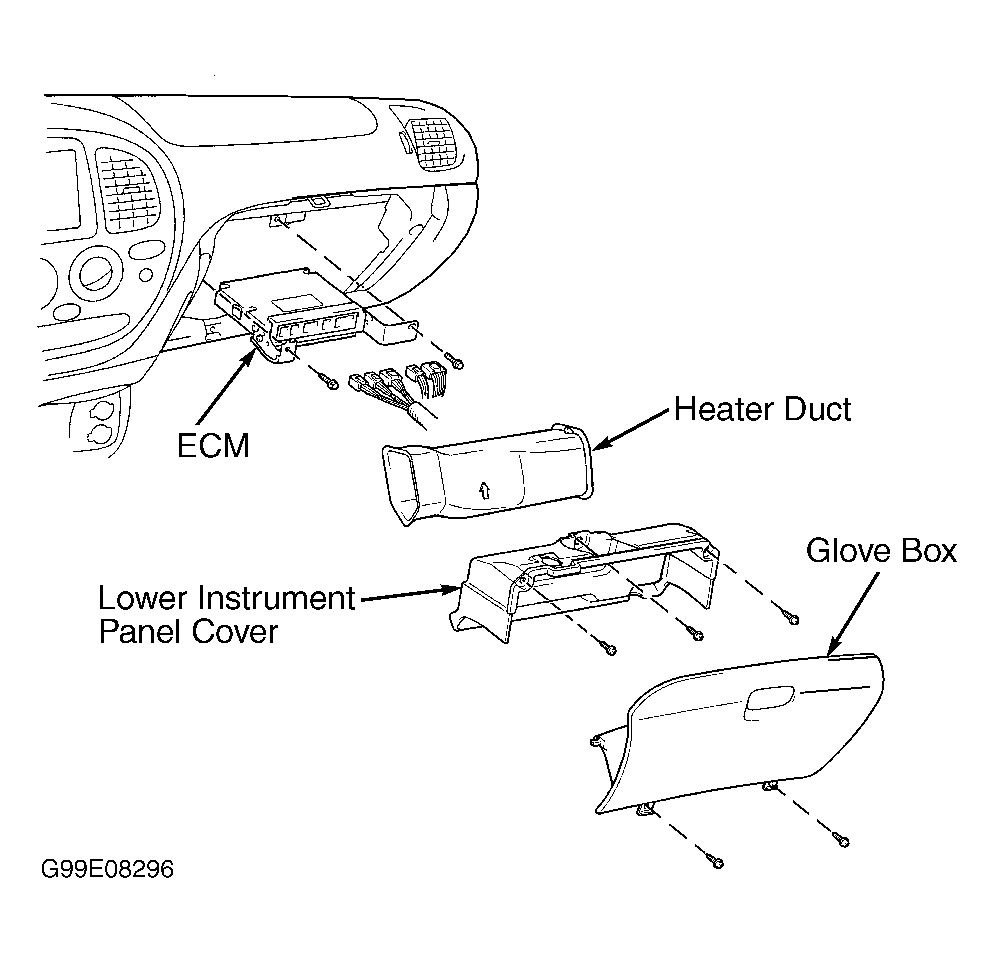 Engine Control Module (ECM) is located behind glove box and heater duct. See
