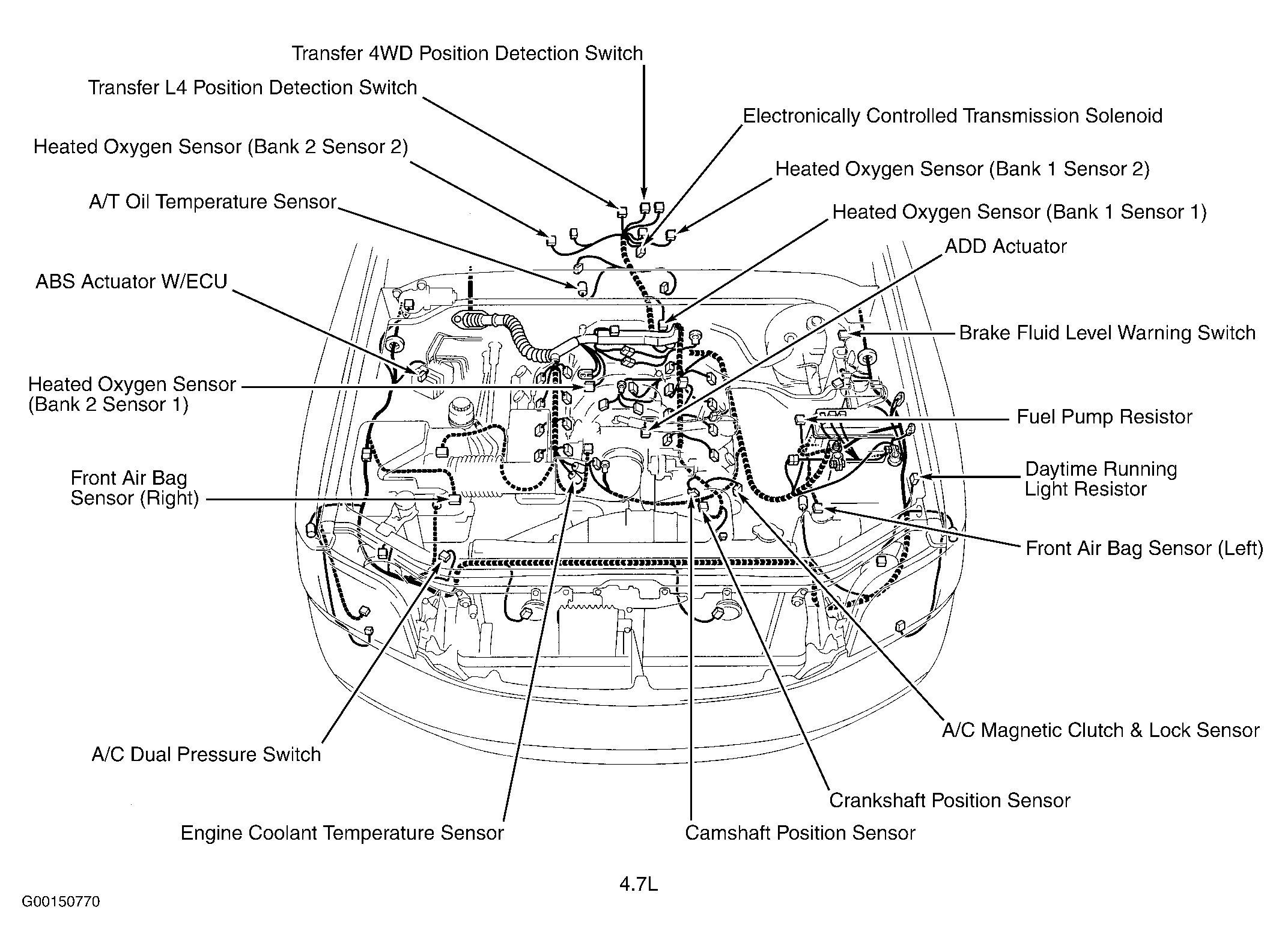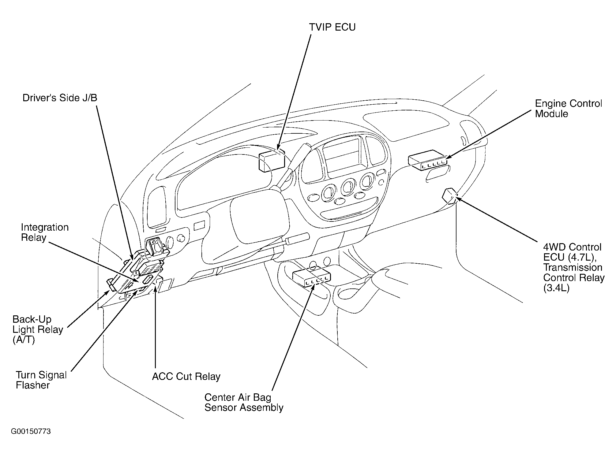 | 4WD Control ECU (4.7L) | Behind lower right side of dash. See Figure. |
