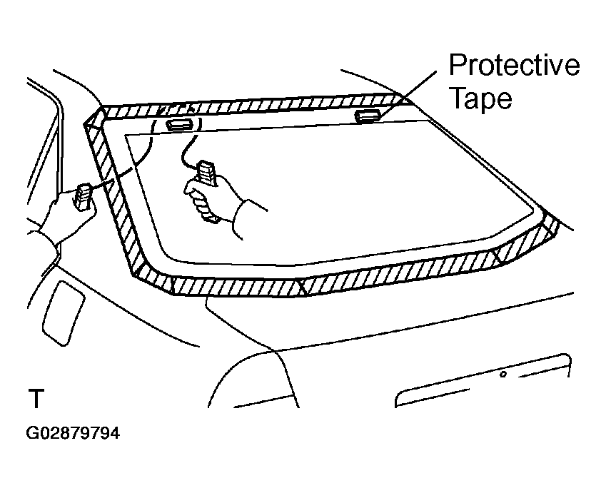 NOTE: When separating the glass, take care not to damage the paint and exterior. - Cut the adhesive by pulling the piano wire around it.