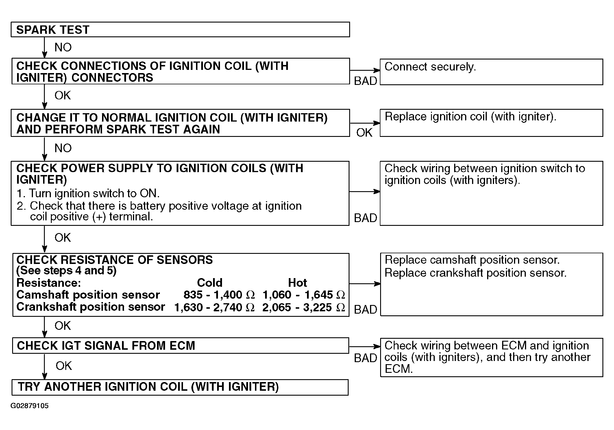 NOTE: To prevent gasoline from being injected from injectors during this test, crank the engine for no more than 5-10 seconds at time.If the spark does not occur, do the test as follows in Fig 1: