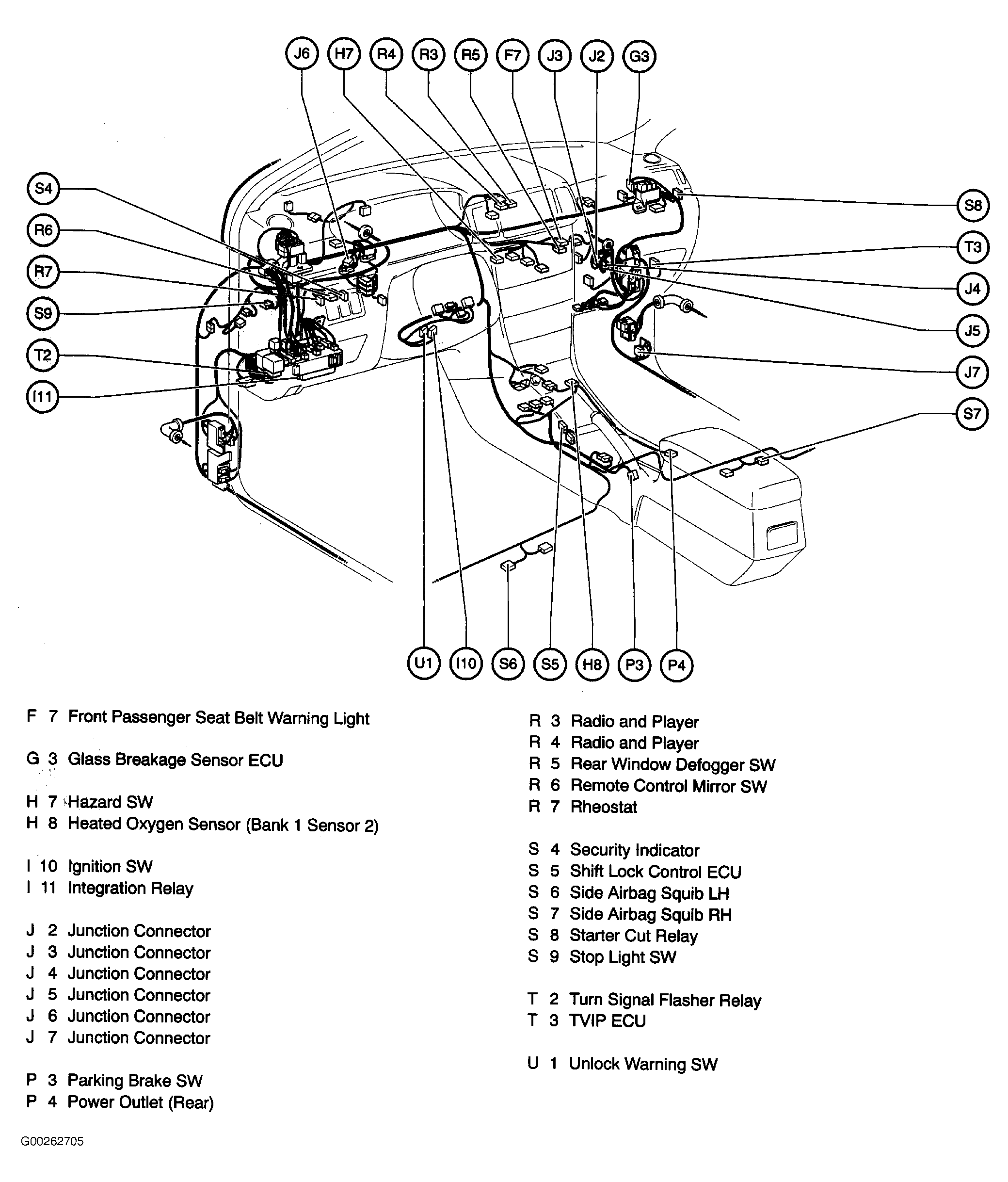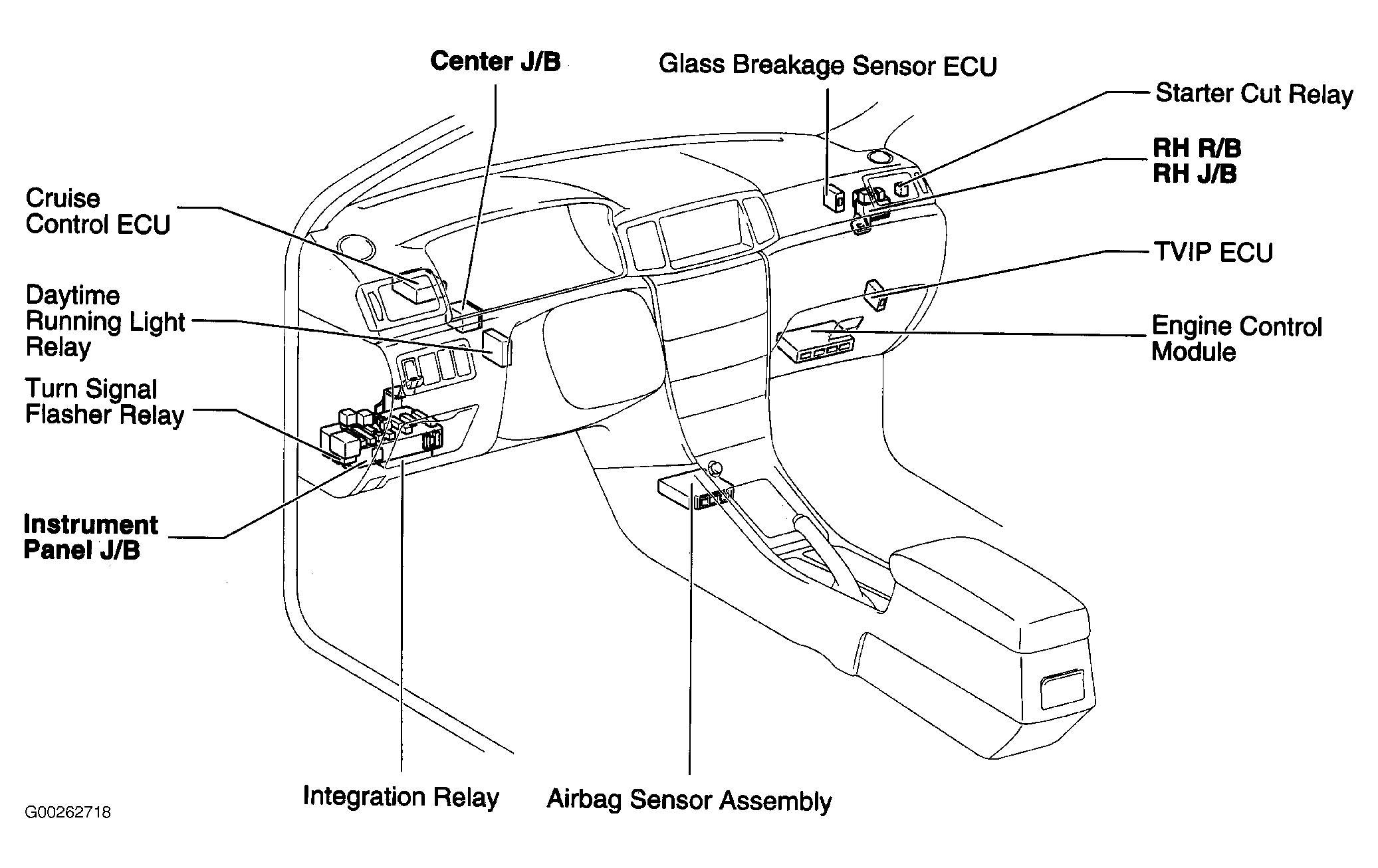 | Air Bag Sensor Assembly | Below front of center console. See Figure. |