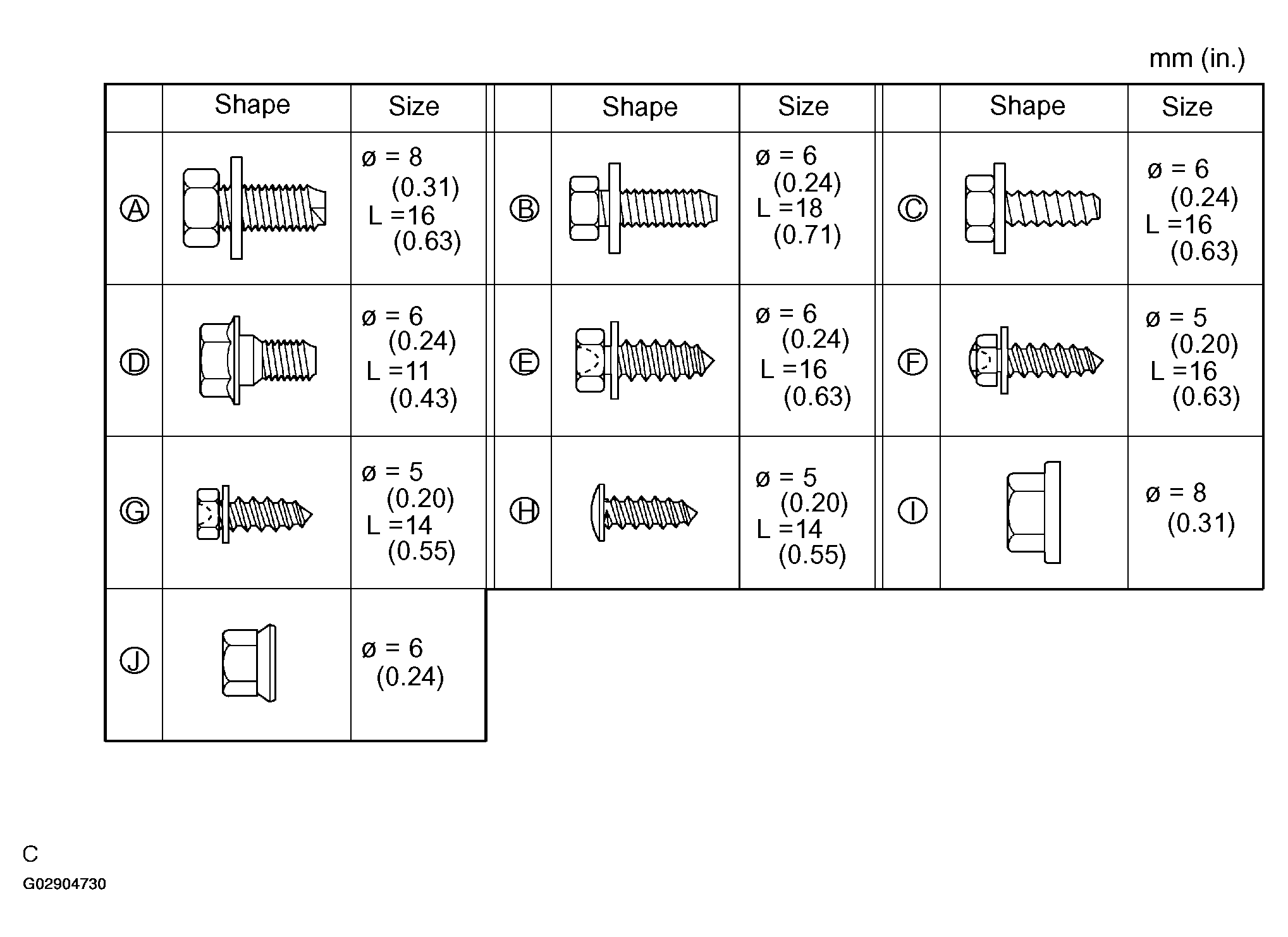 Screw shapes and sizes are indicated in the Fig 3 . The codes ("A" to "I") correspond to those indicated