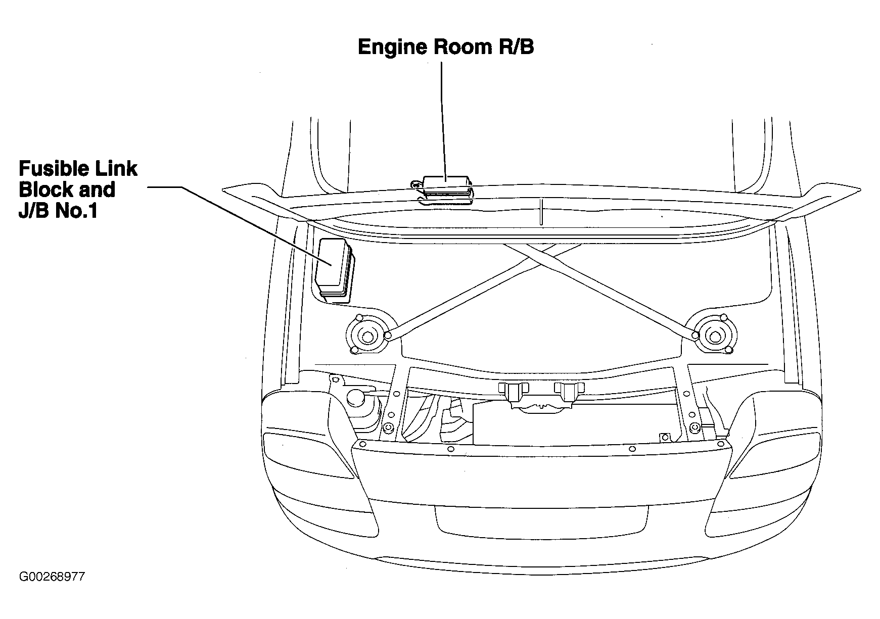 | Fusible Link Block & J/B No. 1 | In left front side of engine compartment. See Figure. |