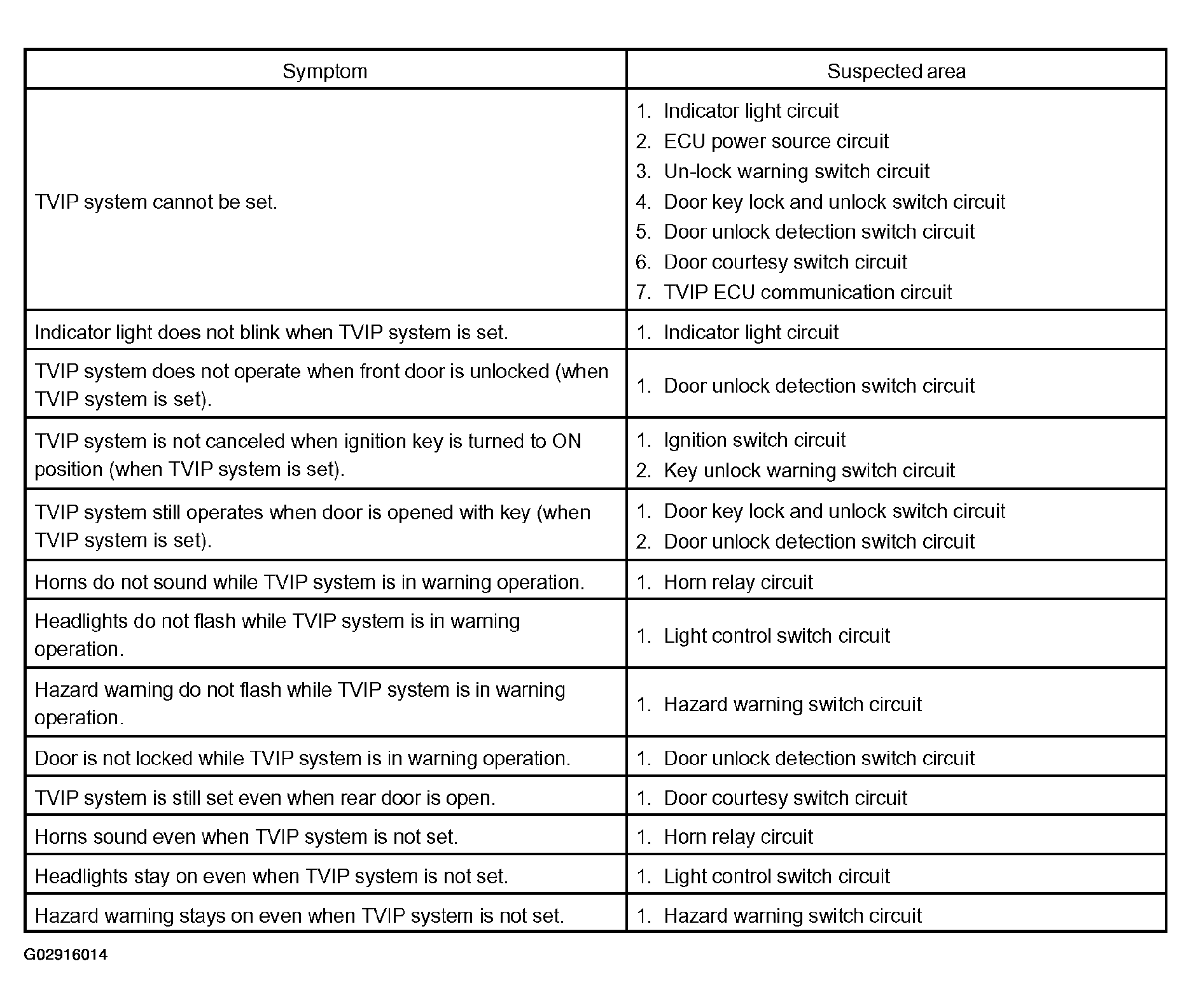 Home >> Toyota >> 2004 >> Matrix Base, 4WD >> Repair and Diagnosis >> Body & Frame >> Door Locks >> Vehicle Intrusion Protection System - Diagnostics >> Problem Symptoms Table