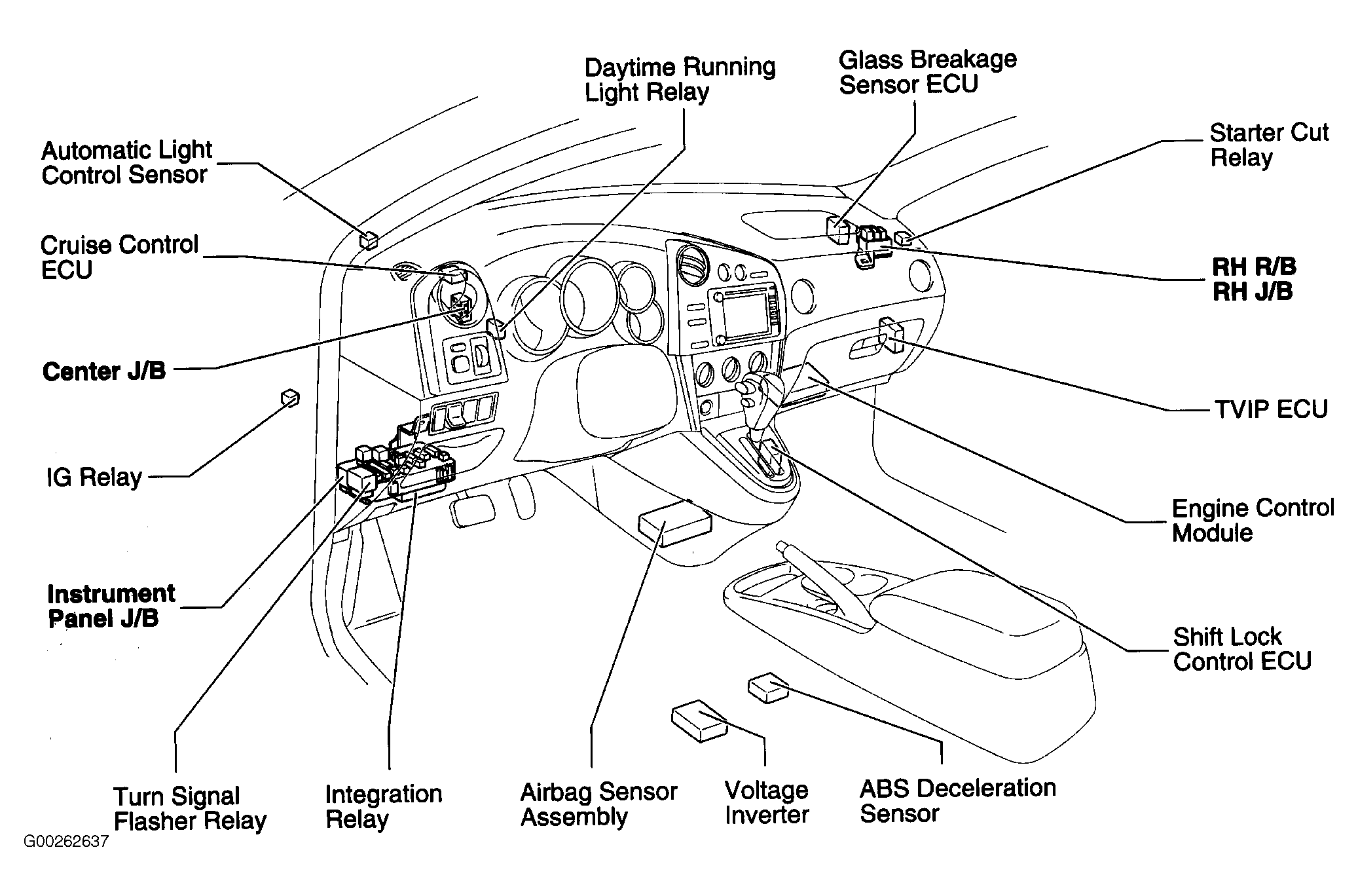Shift Lock Control ECU Below center of dash. See Figure.