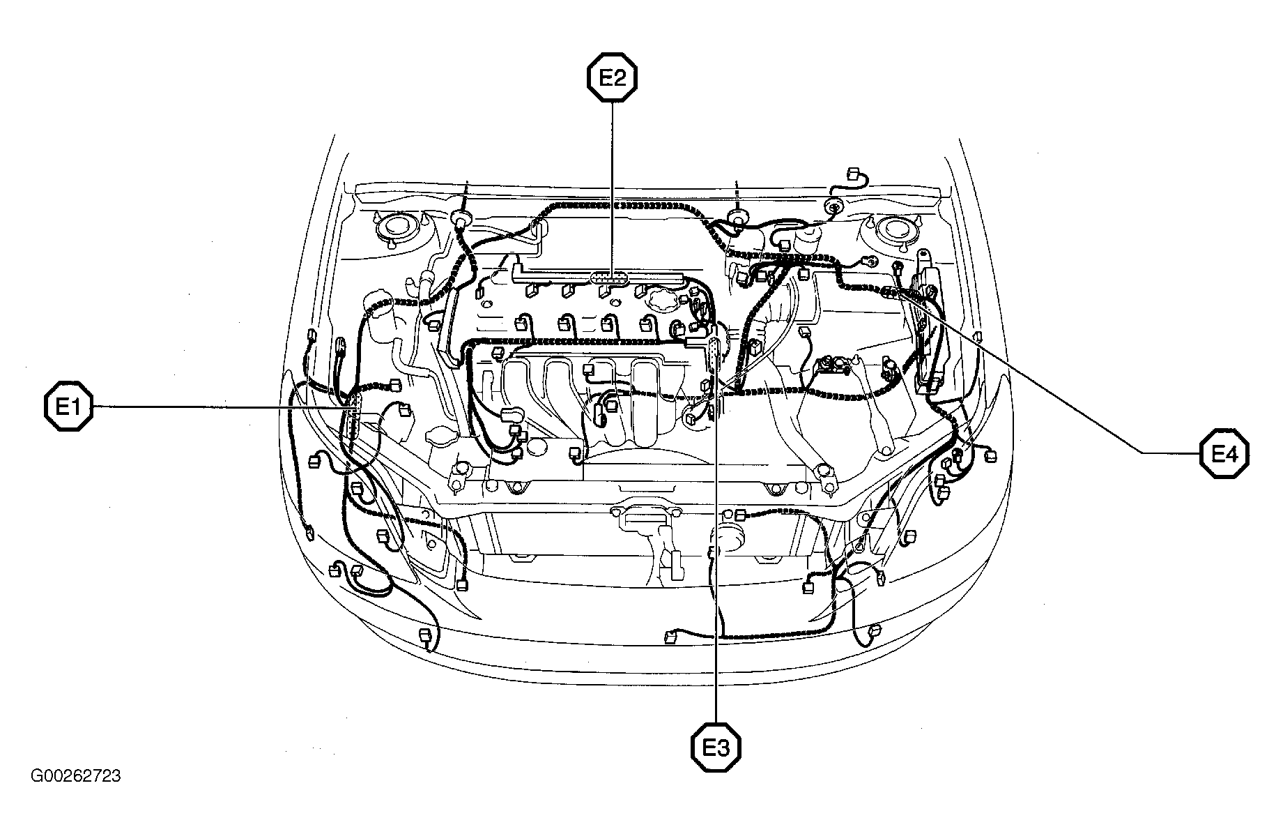 | E1 (Except XRS) | In engine room main harness, at right front corner of engine compartment. See Figure. |