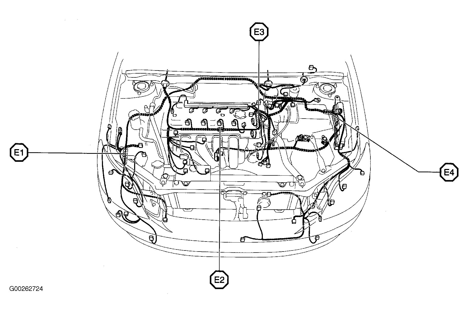| E2 (Except XRS) | In engine harness, at top left of engine. See Figure. |