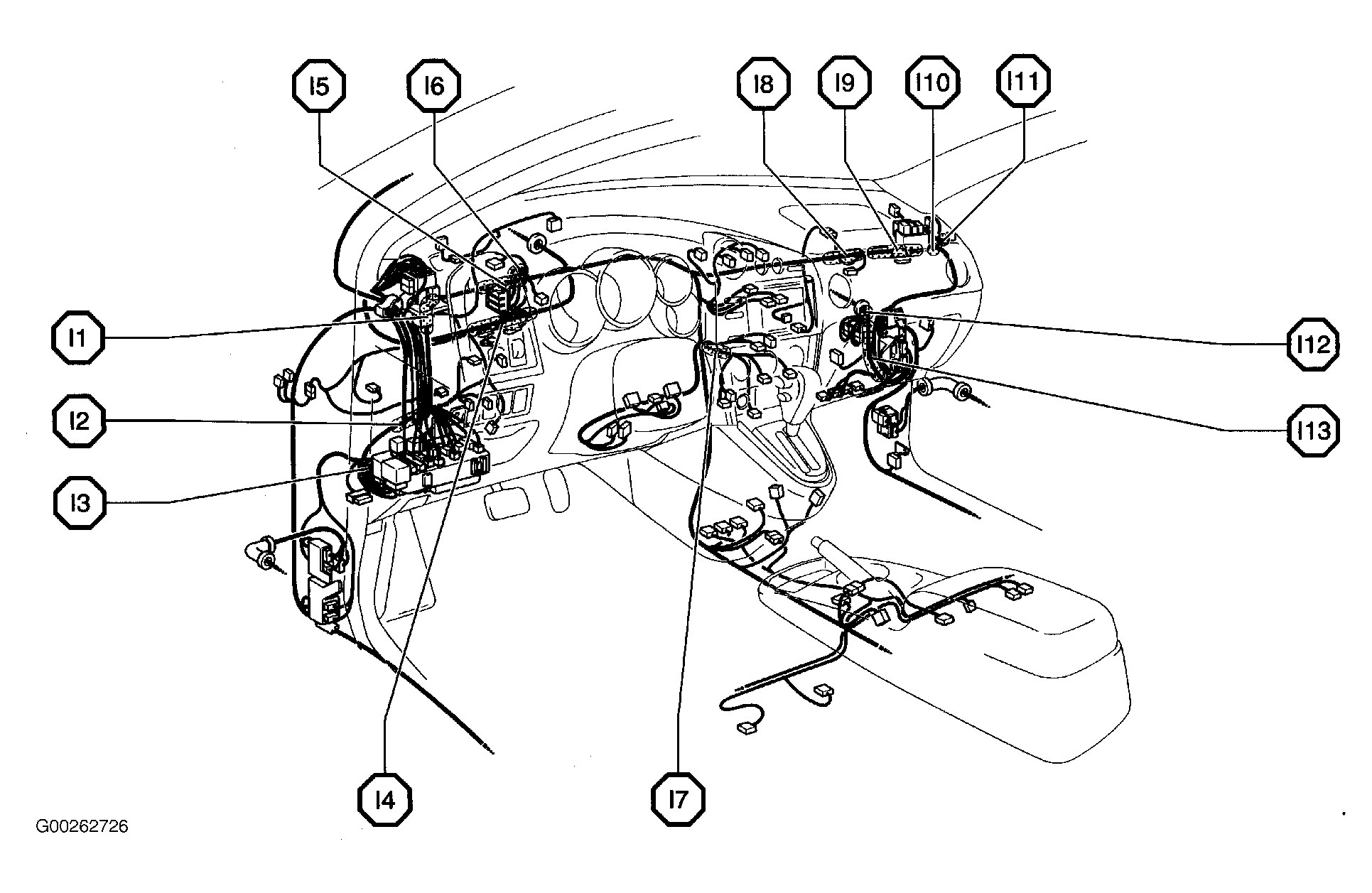 | I9 | In instrument panel harness, behind right end of dash. See Figure. |