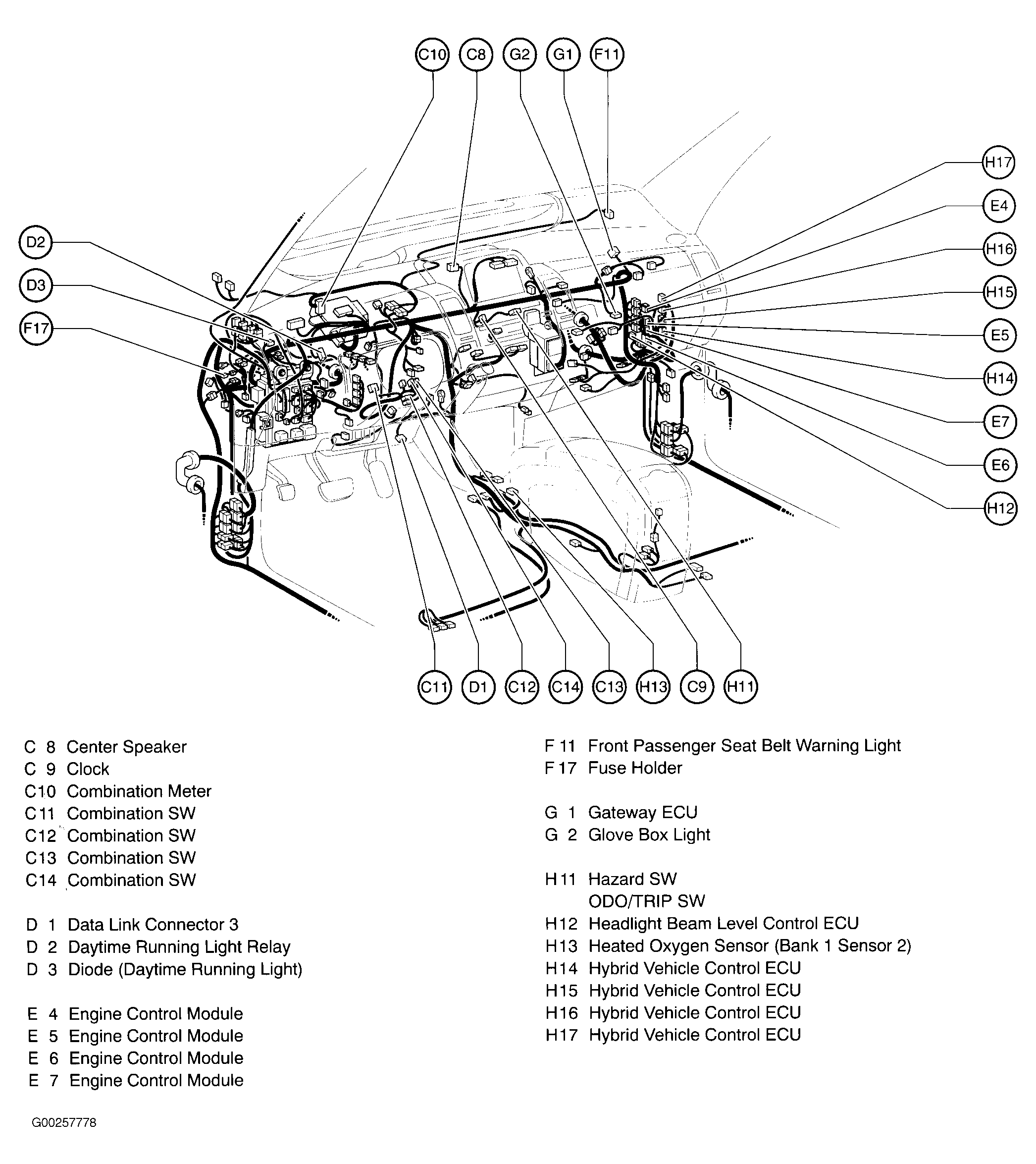 | Hybrid Vehicle Control ECU | Behind right side of dash. See Figure. |