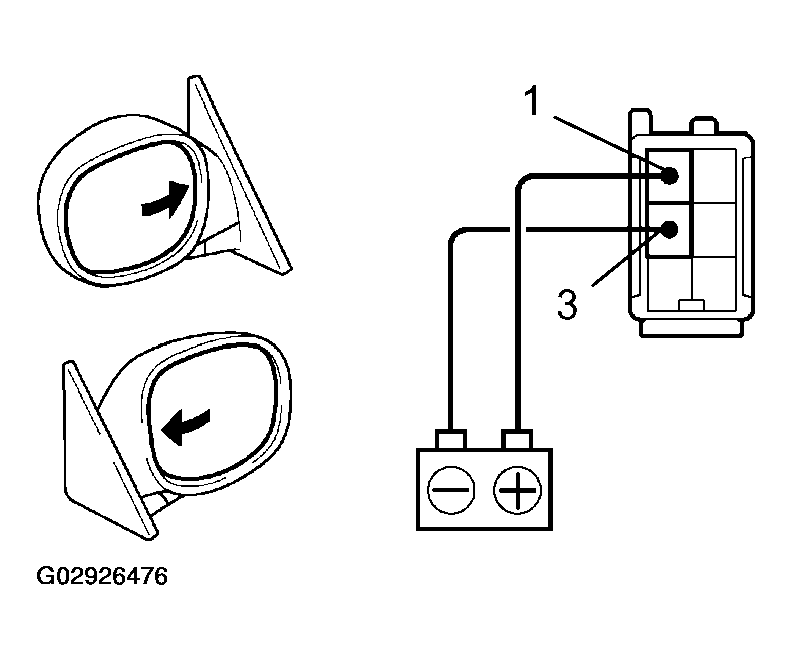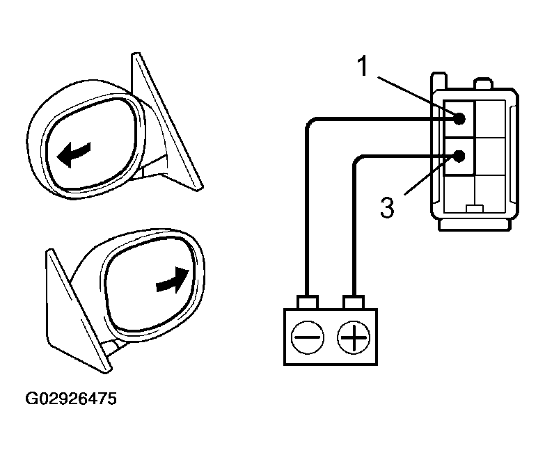 1. Connect the positive (+) lead from the battery to terminal 3 and the negative (-) lead to terminal 1. Check that the mirror angles outward, as shown in Fig 2.