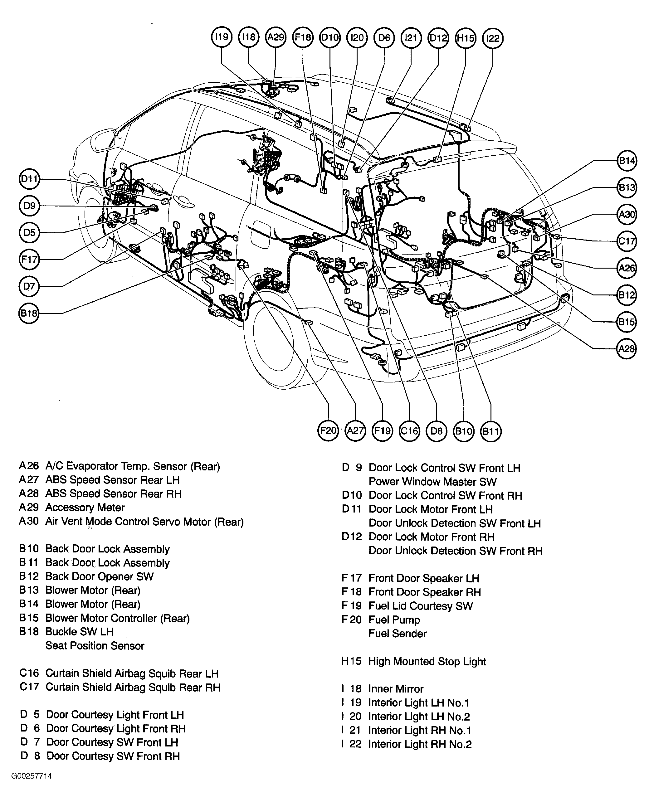 | Moon Roof Control ECU | At center front of roof. See Figure. |