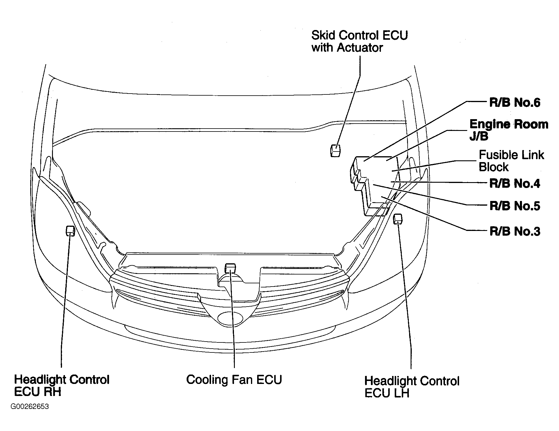 | Skid Control ECU With Actuator | At left rear of engine compartment. See Figure. |