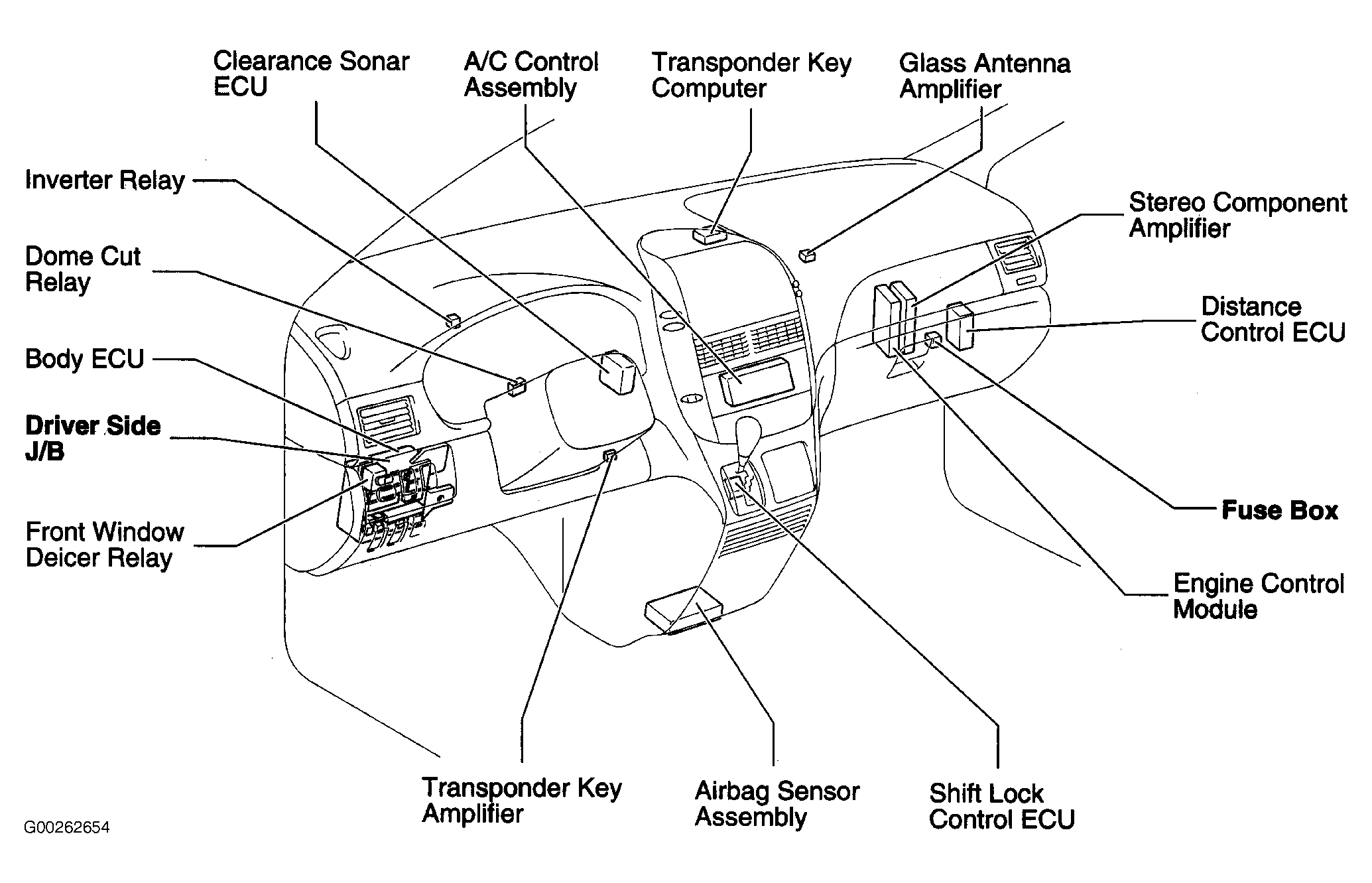 | Distance Control ECU | Behind right side of dash. See Figure. |