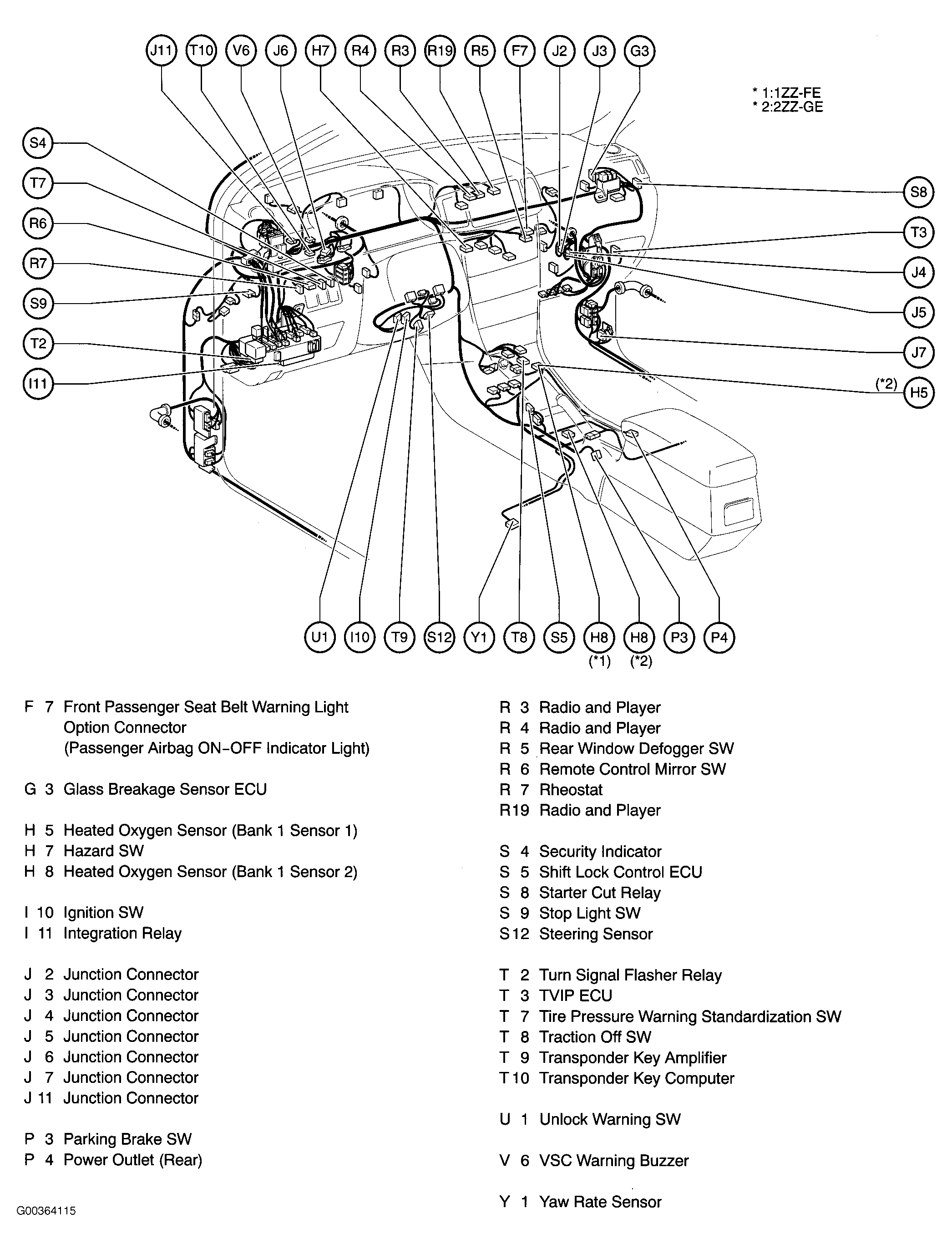 | Air Bag Sensor Assembly | Below front of center console. See Figure. |