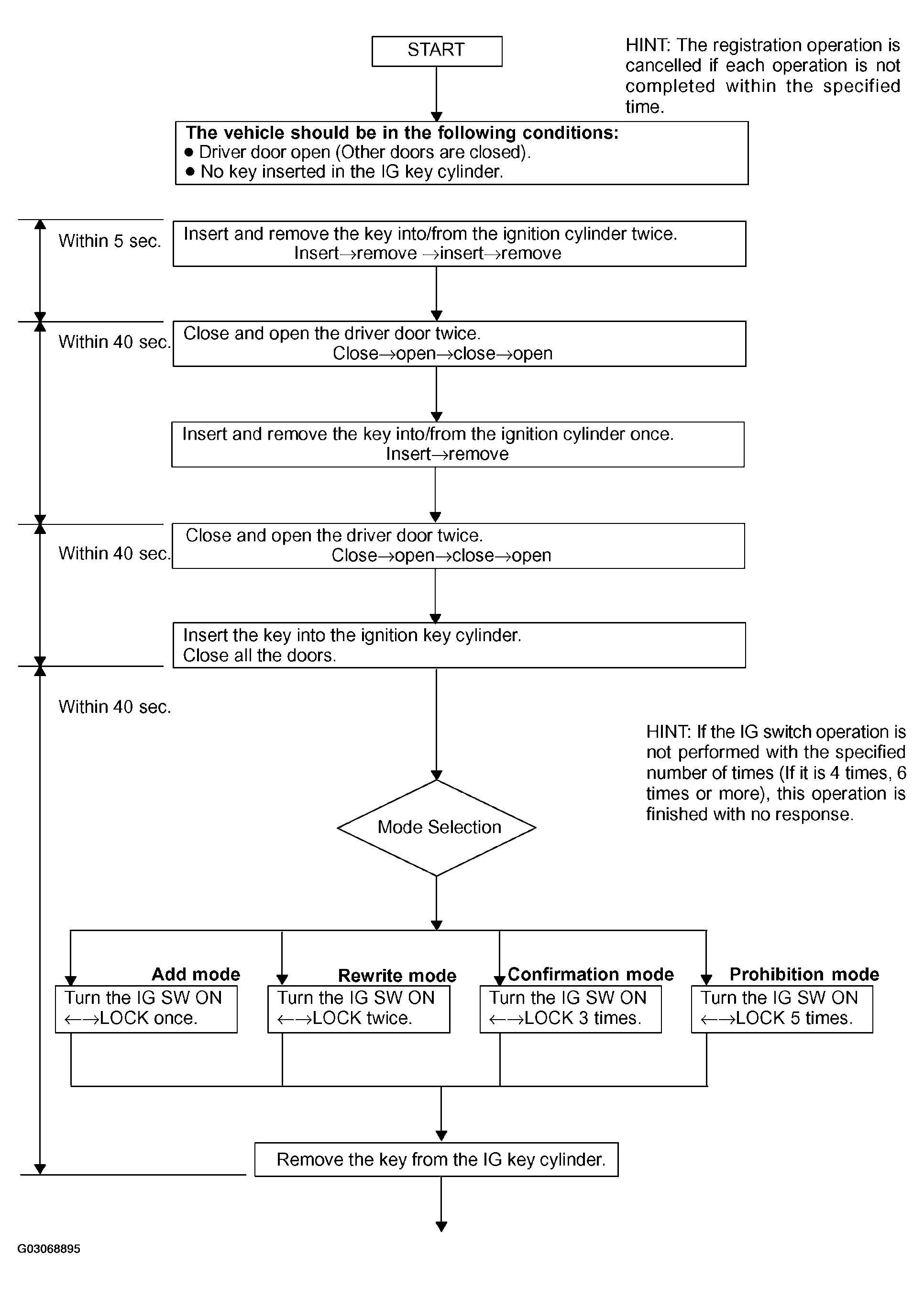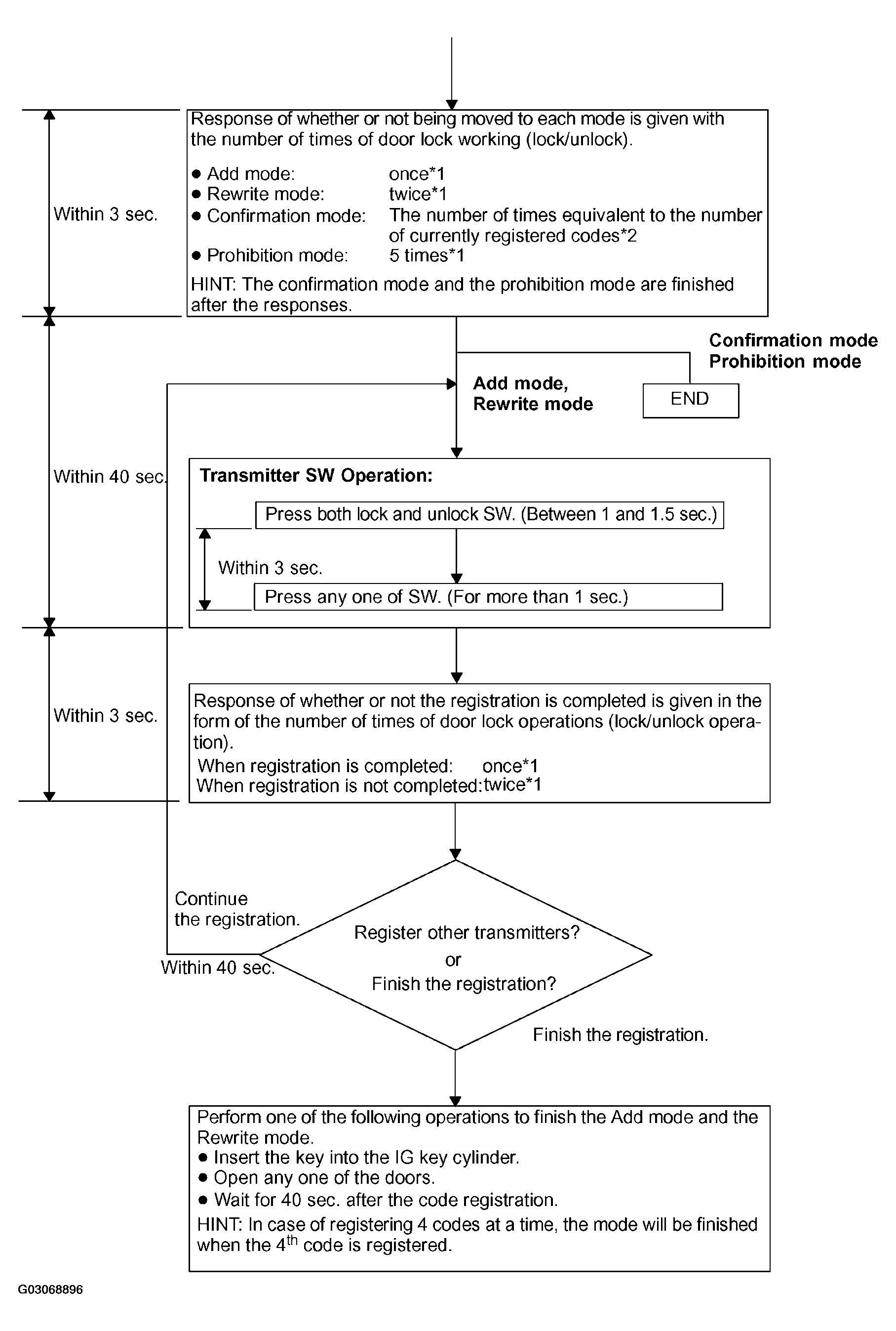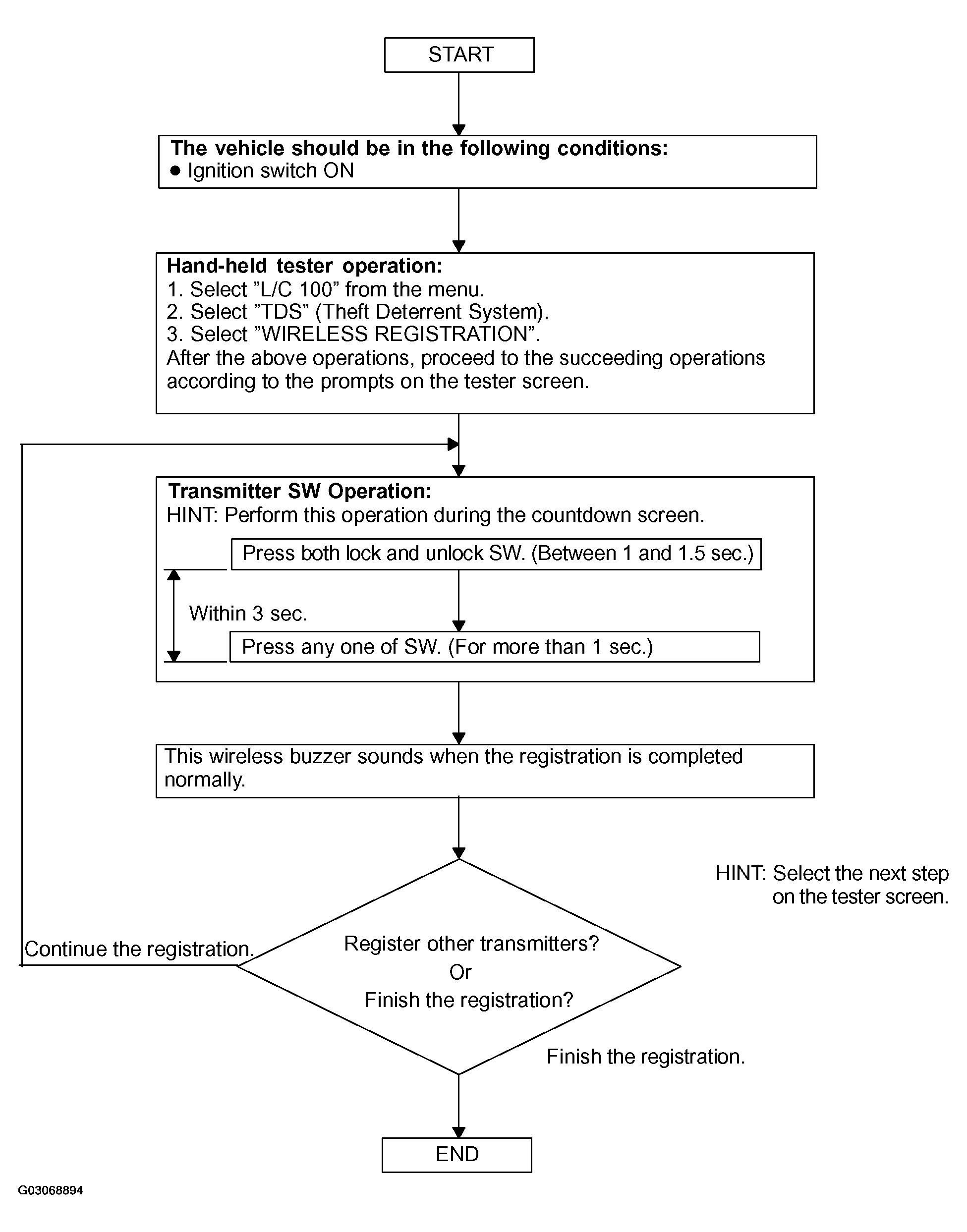- Follow the flow chart to register the transmitter recognition code to the theft deterrent ECU. See Fig 1 or Fig 2 and Fig 3