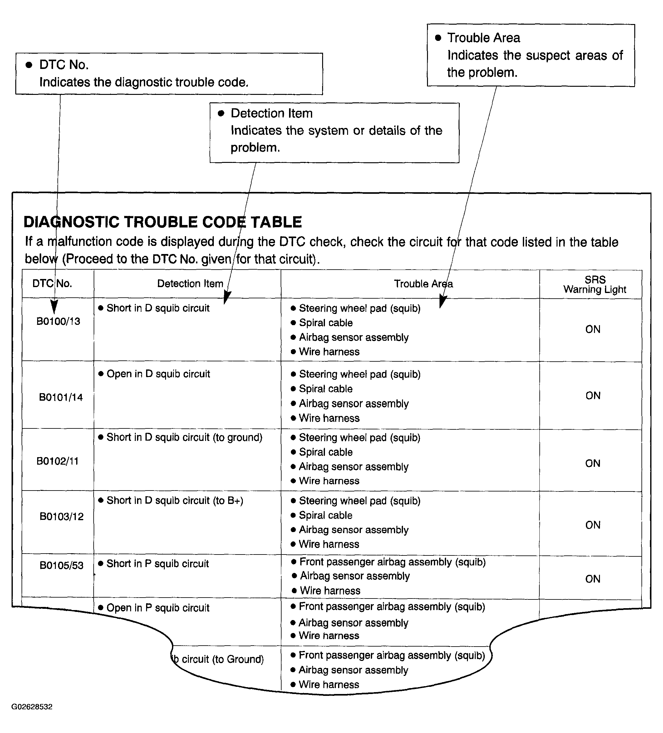 The inspection procedures are shown in Fig 1. This table allows efficient and accurate troubleshooting using the diagnostic trouble codes displayed in the diagnostic trouble code table. Proceed with troubleshooting in accordance with the inspection procedures listed in the diagnostic table corresponding to the diagnostic trouble codes displayed. The diagnostic trouble code table for the Supplemental Restraint System is shown below as an example.