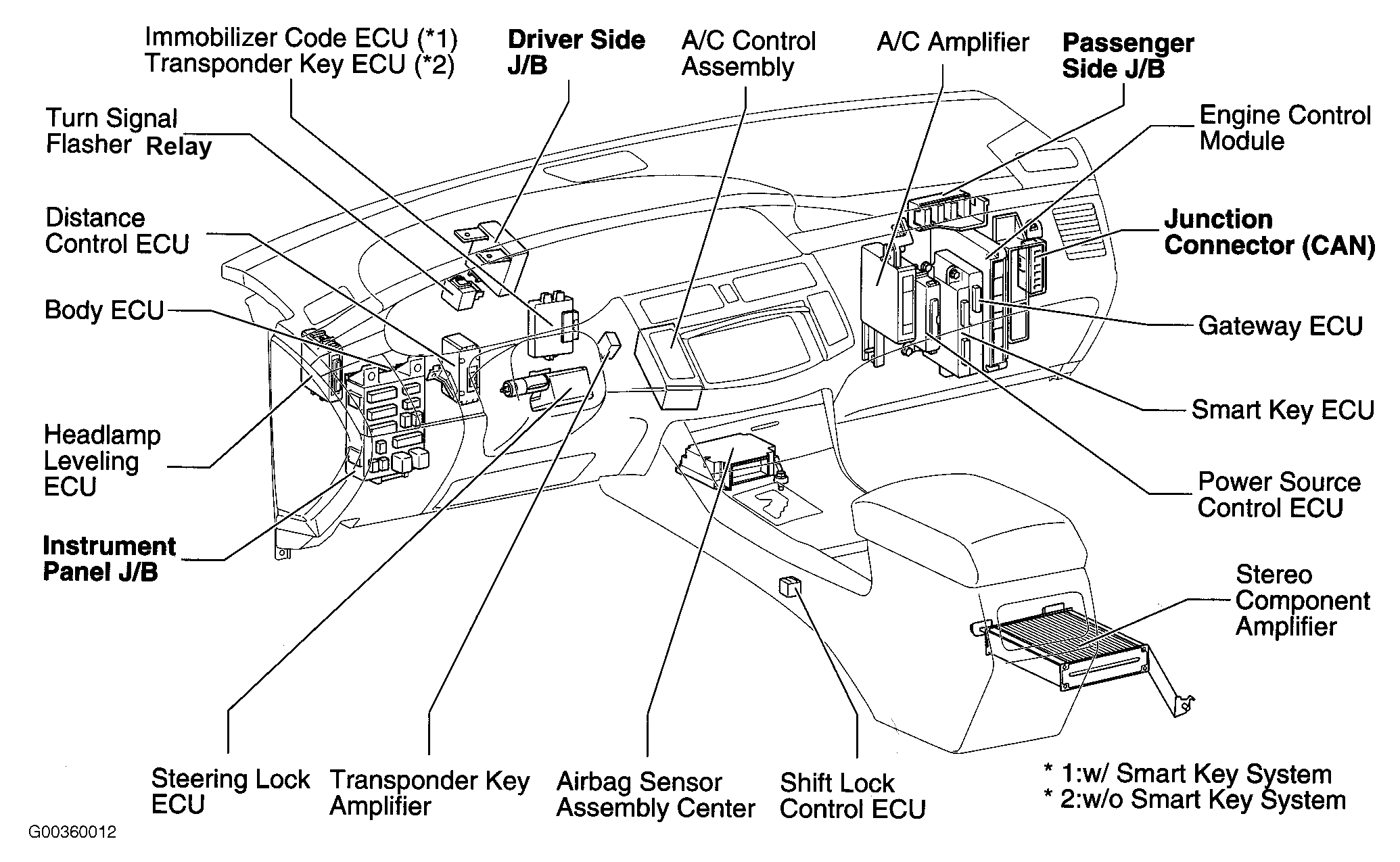 | Smart Key ECU | Behind right side of dash. See Figure. |
