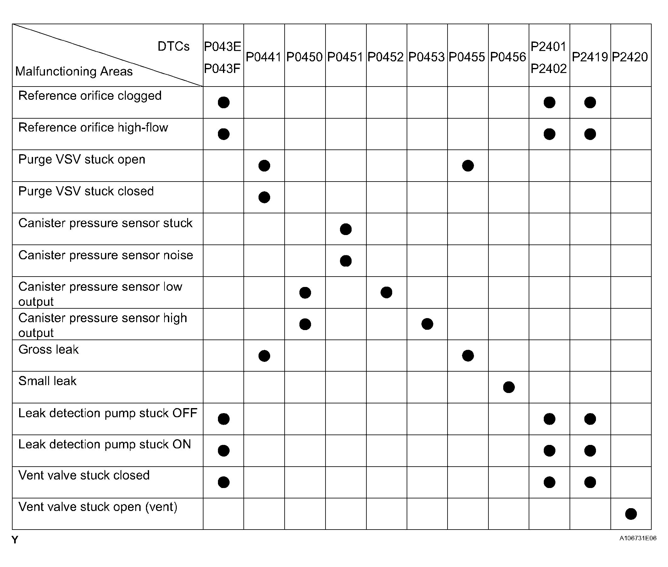 B P043E EVAP pressure in step (b) below -4.85 kPa (-36.38 mmHg) Reference orifice clogged C P2419 EVAP pressure in step (a) more than -1.06 kPa (-7.95 mmHg) Vent valve stuck closed D (1) The DTCs related to the EVAP system are displayed on the intelligent tester when checking.