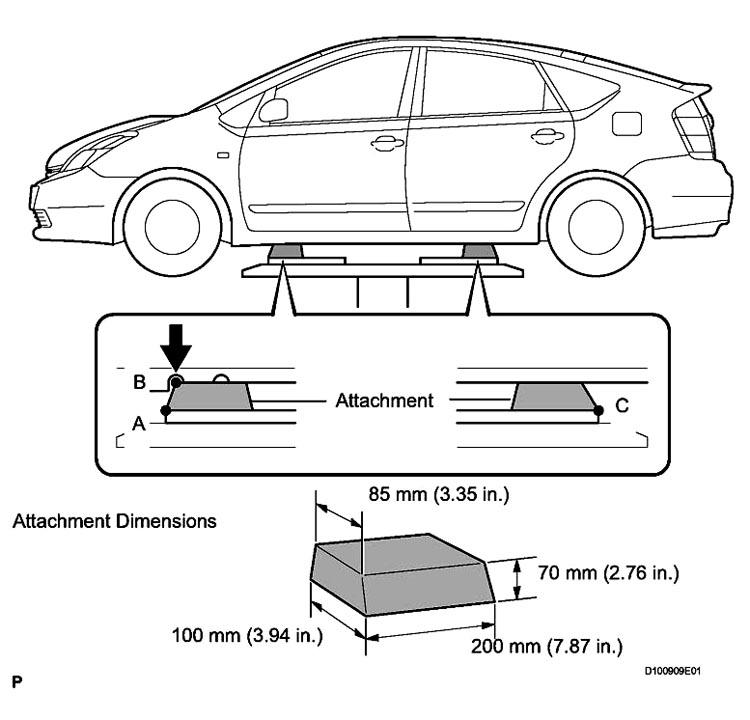 PLATE TYPE LIFT SPECIFICATIONSRight and left set position Place the vehicle over the center of the lift. Front and rear set position Place the attachments at the ends of the rubber plate surface, under the vehicle lift pad (A and C in the illustration). Raise the plate slightly and reposition the vehicle so the top of the attachment (B in the illustration) is aligned with the front side notch in the vehicle rocker flange. - Use the lift to raise the vehicle up off the ground, and shake the vehicle to make sure that it is stable.