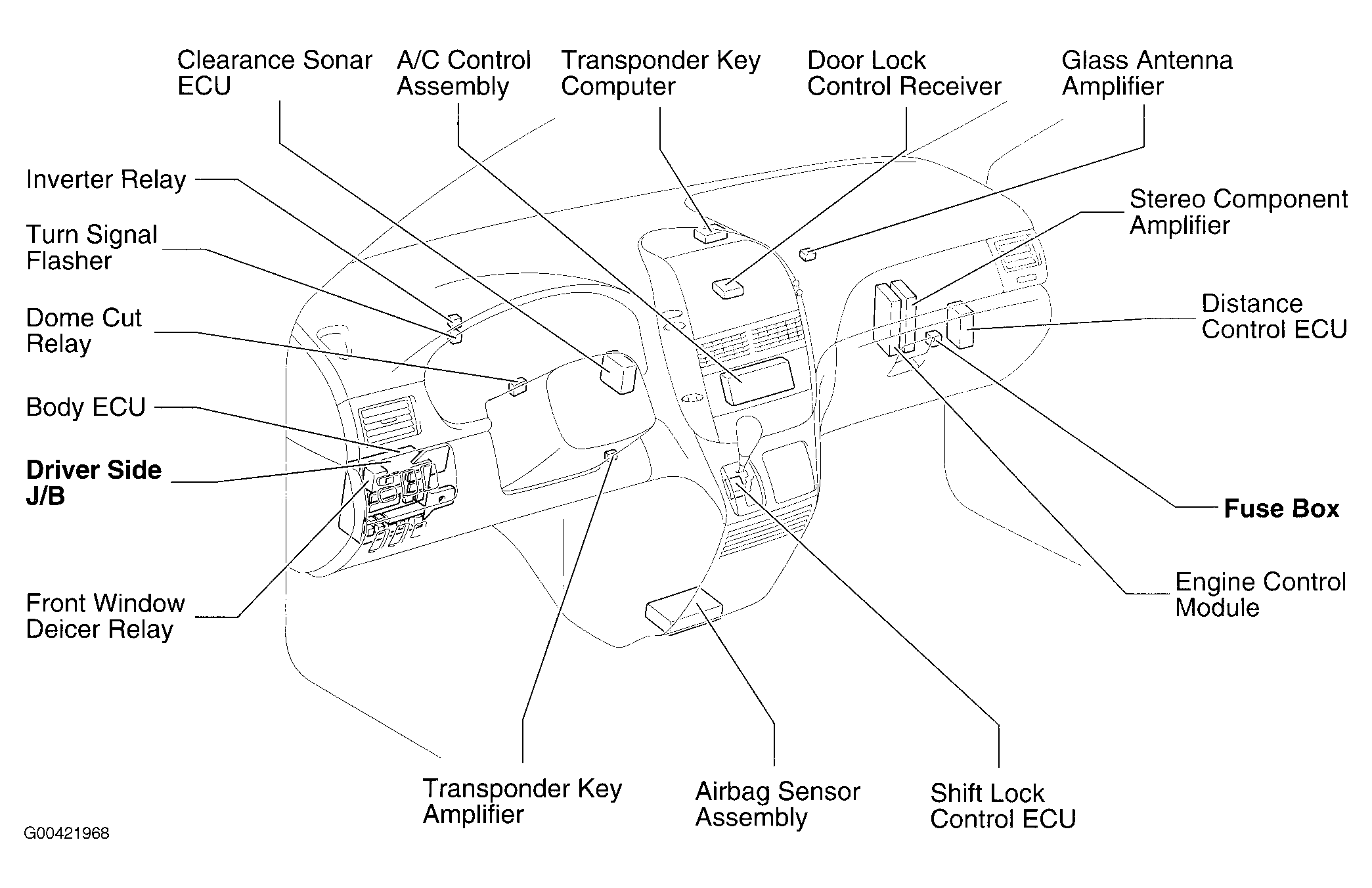 | Distance Control ECU | Behind right side of dash. See Figure. |