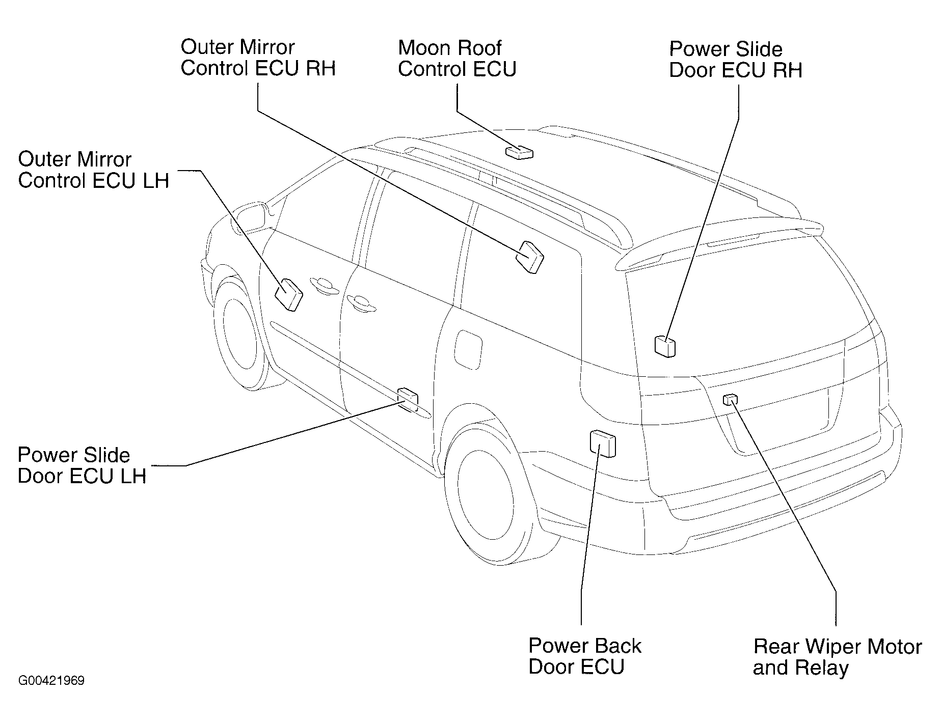 | Power Slide Door ECU LH | In left siding door. See Figure. |