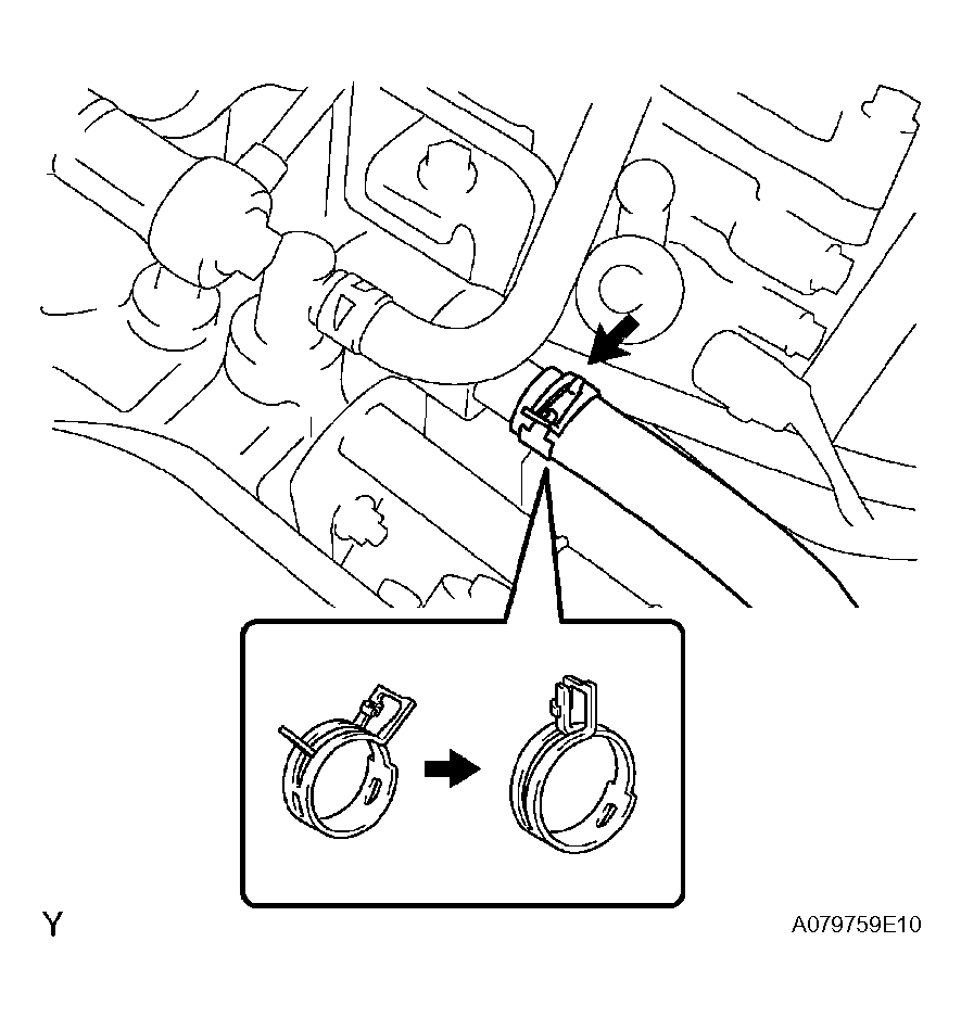 - Lock the hose clamp as shown in Fig 6 and remove the water outlet together with the No. 1 water by-pass hose.