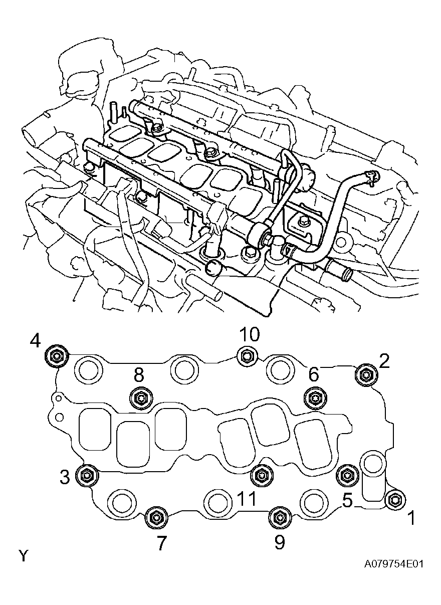 - In order to remove the intake manifold, using several steps, remove the 9 bolts and the 2 nuts in the sequence shown in Fig 4 .