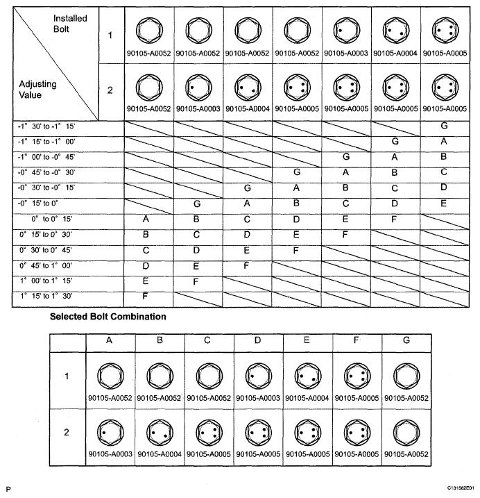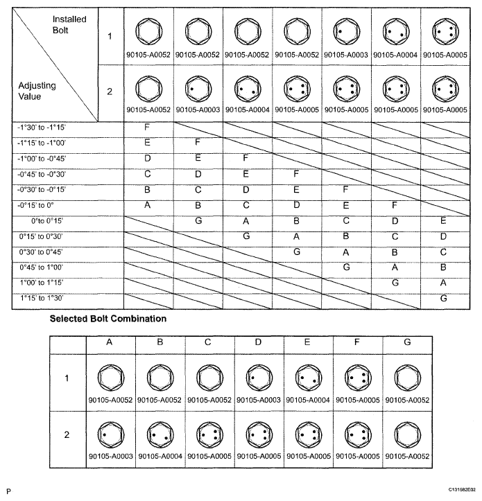Check installed bolts combination. Select appropriate bolts from the table below to adjust the camber to within the specified range.