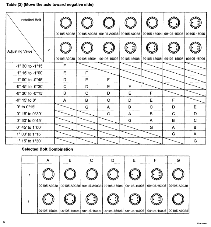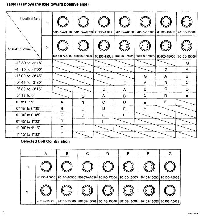 9. Check installed bolts combination. Select appropriate bolts from the table below to adjust the camber to within the specified range.