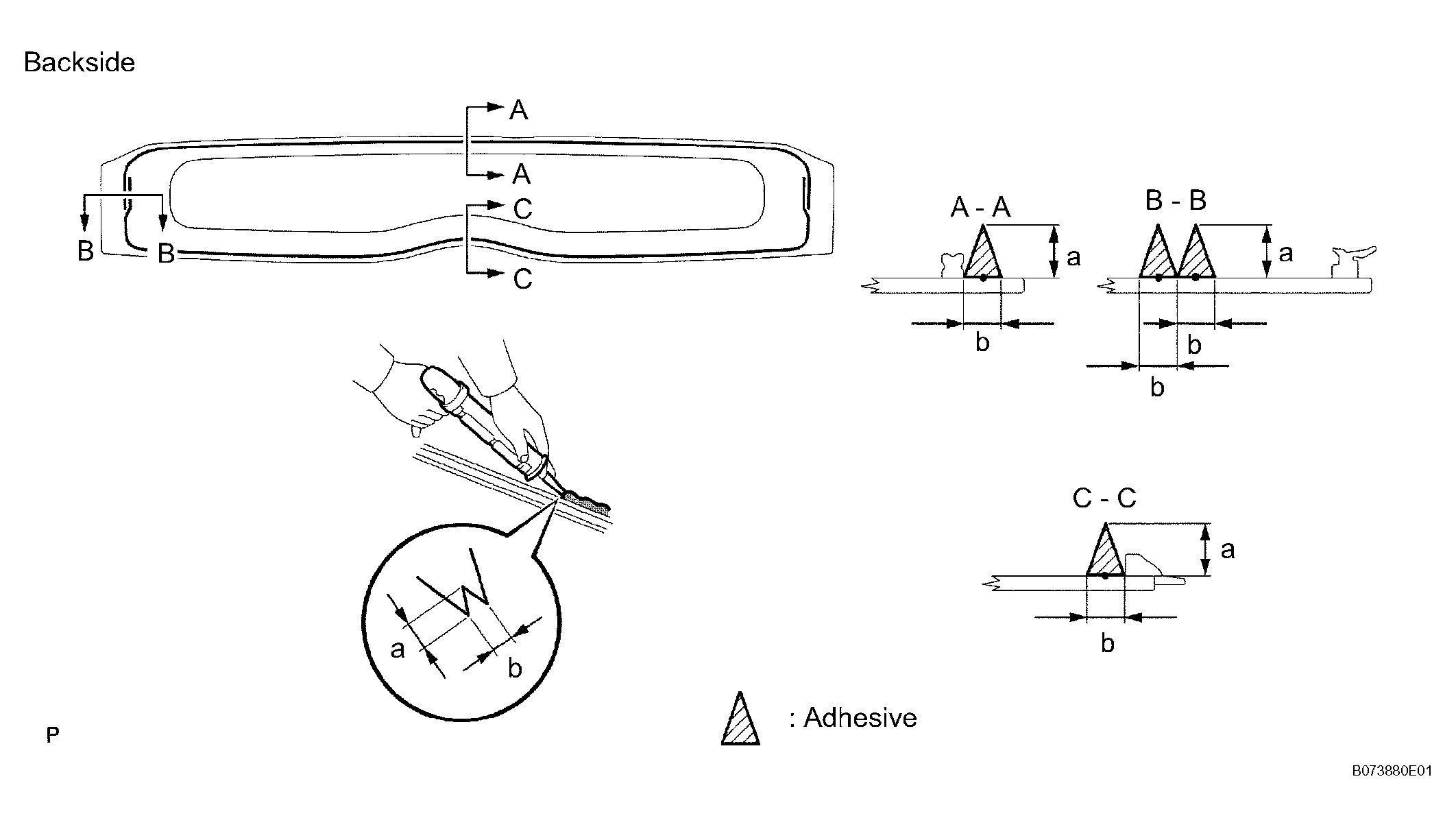 3. Apply adhesive to the back door glass as shown in the illustration.