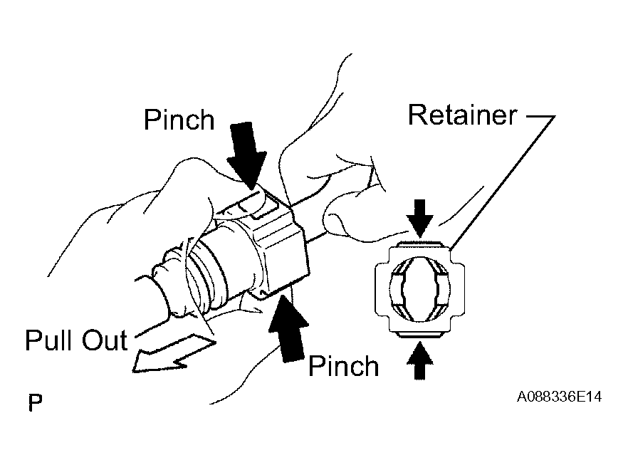 - Pinch the retainer as illustrated, then pull out the fuel tube connector from the pipe.
