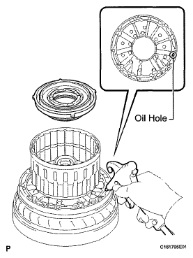 - While applying compressed air to the oil hole, remove the C-2 accumulator piston and spring.