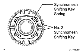 - Install the synchromesh shifting key spring and No. 2 synchromesh shifting keys as shown in the illustration (Fig 11).